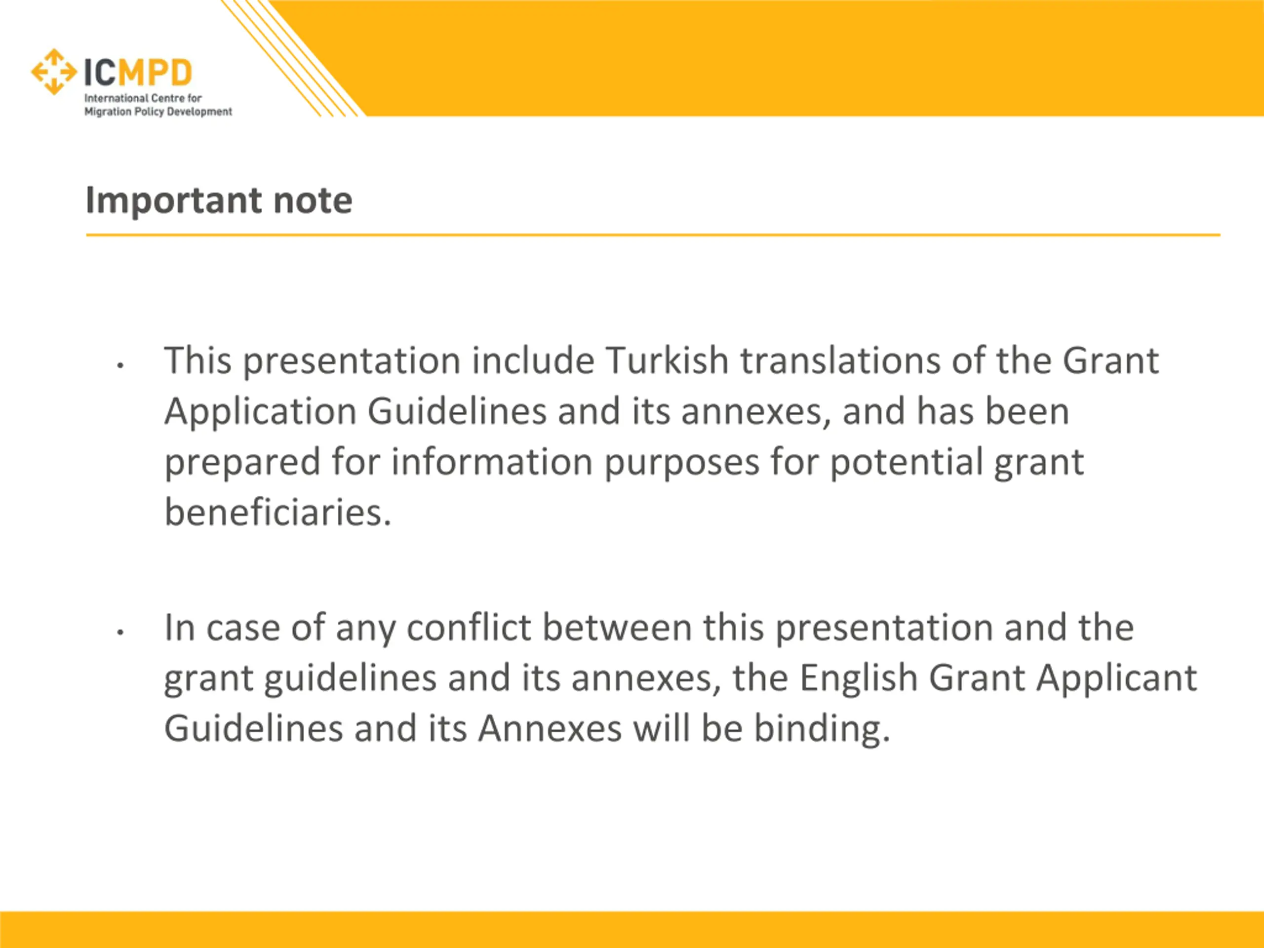 Important note This presentation include Turkish translations of the Grant Application Guidelines and its annexes, and has been prepared for information purposes for potential grant beneficiaries. In case of any conflict between this presentation and the grant guidelines and its annexes, the English Grant Applicant Guidelines and its Annexes will be binding.