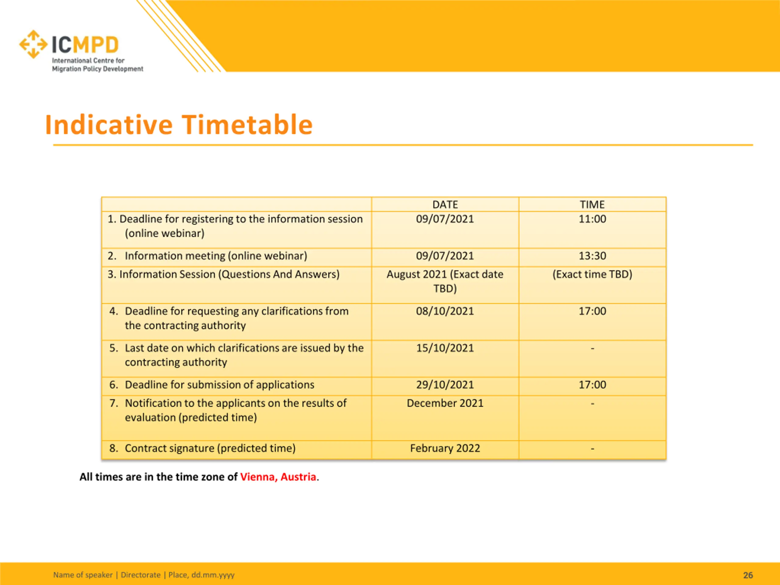 Indicative Timetable DATE TIME 11:00 1. Deadline for registering to the information session (online webinar) 09/07/2021 2. Information meeting (online webinar) 09/07/2021 13:30 3. Information Session (Questions And Answers) August 2021 (Exact date TBD) (Exact time TBD) 4. Deadline for requesting any clarifications from the contracting authority 08/10/2021 17:00 5. Last date on which clarifications are issued by the contracting authority 15/10/2021 - 6. Deadline for submission of applications 29/10/2021 17:00 7. Notification to the applicants on the results of evaluation (predicted time) December 2021 - 8. Contract signature (predicted time) February 2022 - All times are in the time zone of Vienna, Austria. 26 Name of speaker | Directorate | Place, dd.mm.yyyy