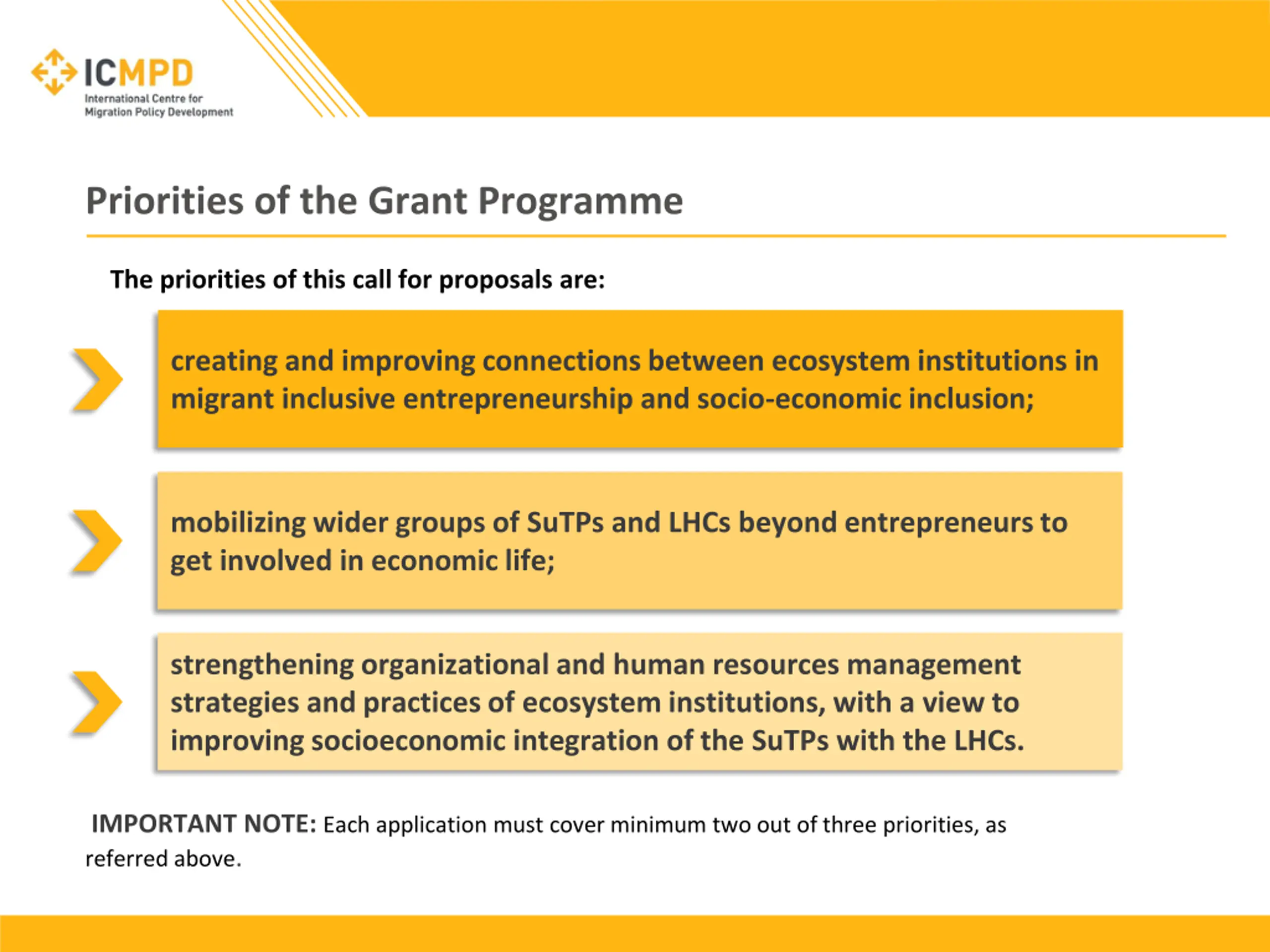 Priorities of the Grant Programme The priorities of this call for proposals are: creating and improving connections between ecosystem institutions in migrant inclusive entrepreneurship and socio-economic inclusion; mobilizing wider groups of SuTPs and LHCs beyond entrepreneurs to get involved in economic life; strengthening organizational and human resources management strategies and practices of ecosystem institutions, with a view to improving socioeconomic integration of the SuTPs with the LHCs. IMPORTANT NOTE: Each application must cover minimum two out of three priorities, as referred above.