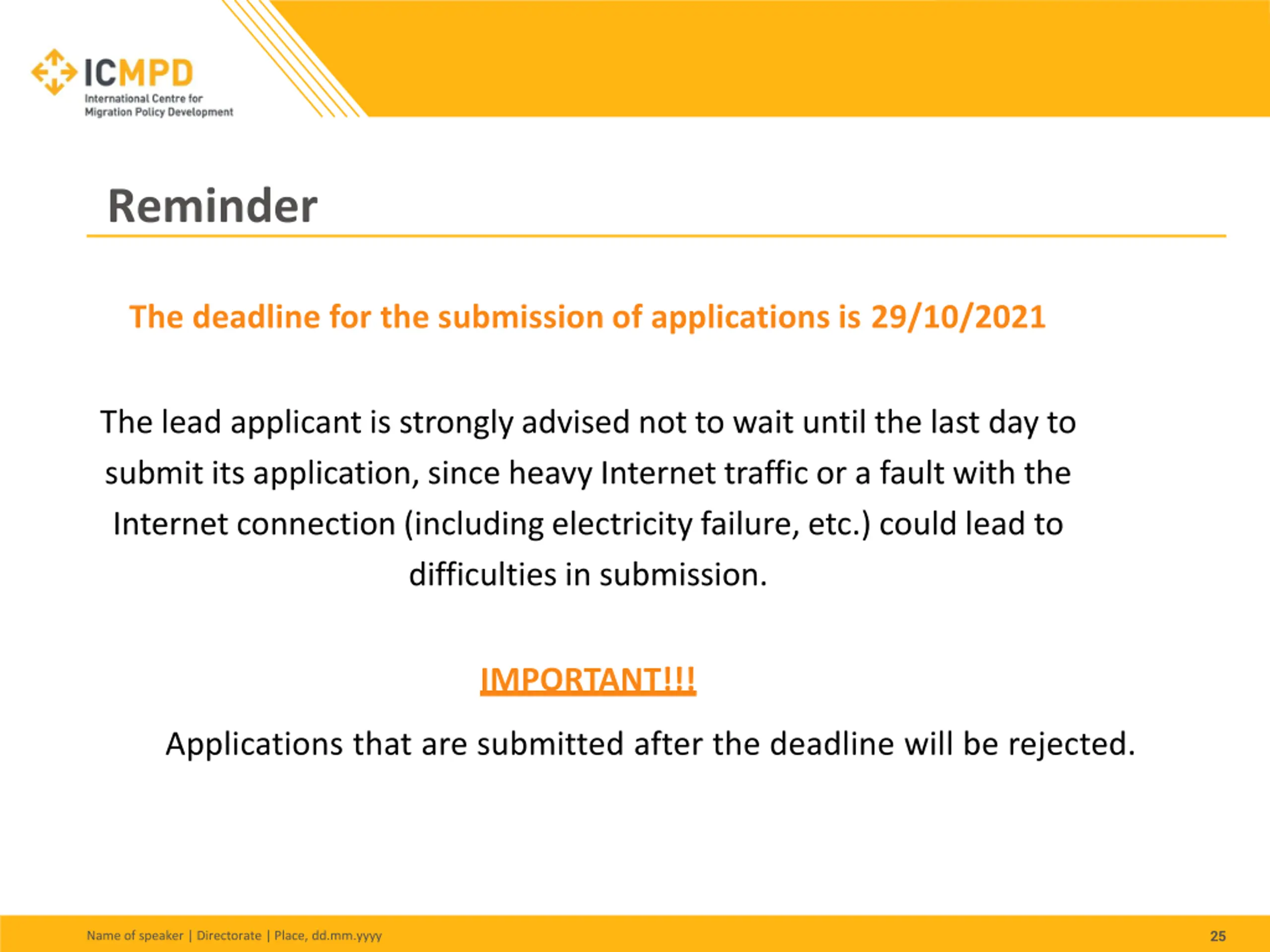 Reminder The deadline for the submission of applications is 29/10/2021 The lead applicant is strongly advised not to wait until the last day to submit its application, since heavy Internet traffic or a fault with the Internet connection (including electricity failure, etc.) could lead to difficulties in submission. IMPORTANT!!! Applications that are submitted after the deadline will be rejected. 25 Name of speaker | Directorate | Place, dd.mm.yyyy