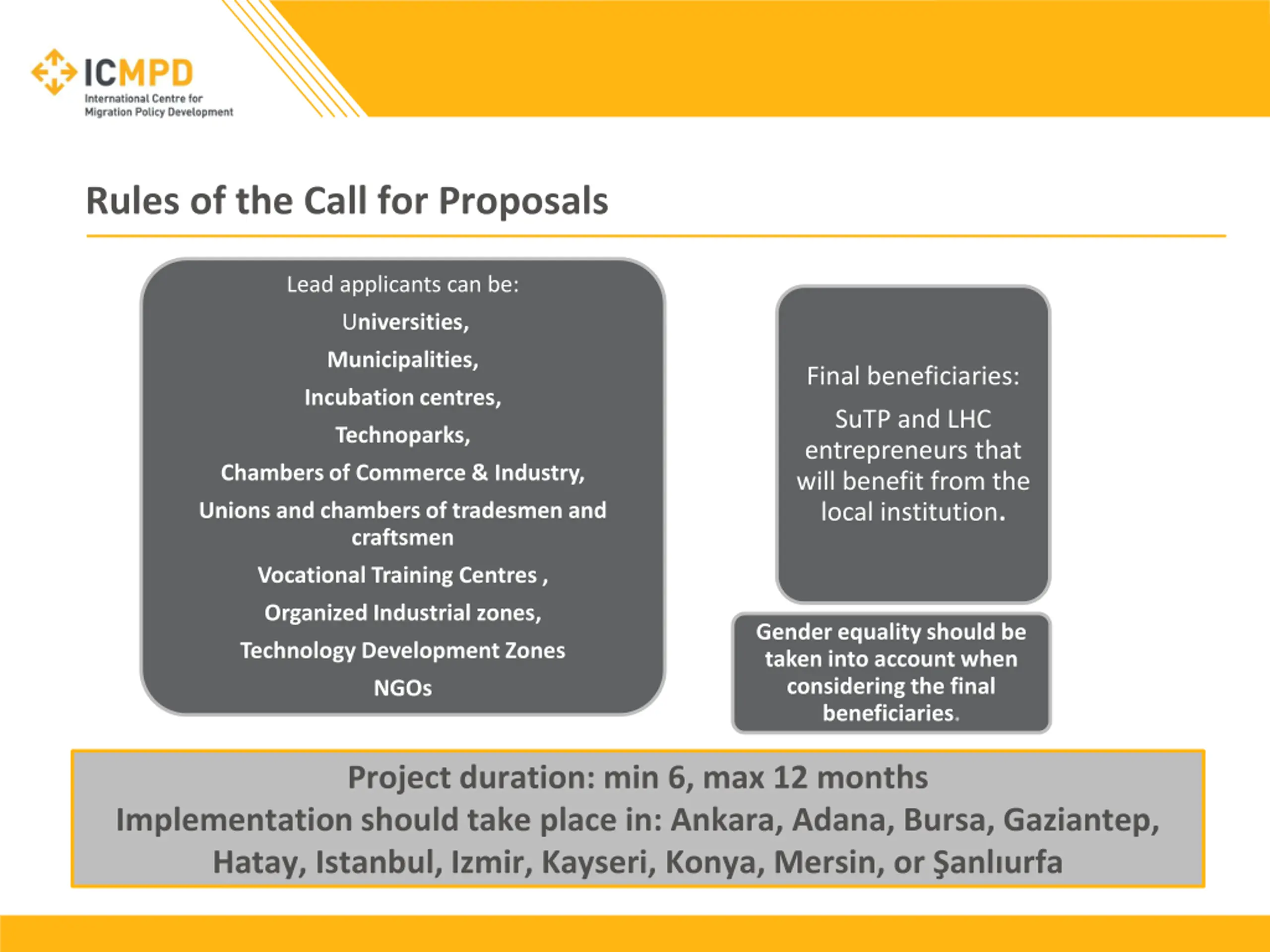 Rules of the Call for Proposals Lead applicants can be: Universities, Municipalities, Final beneficiaries: Incubation centres, SuTP and LHC entrepreneurs that will benefit from the local institution. Technoparks, Chambers of Commerce & Industry, Unions and chambers of tradesmen and craftsmen Vocational Training Centres , Organized Industrial zones, Gender equality should be taken into account when considering the final beneficiaries. Technology Development Zones NGOs Project duration: min 6, max 12 months Implementation should take place in: Ankara, Adana, Bursa, Gaziantep, Hatay, Istanbul, Izmir, Kayseri, Konya, Mersin, or anl urfa