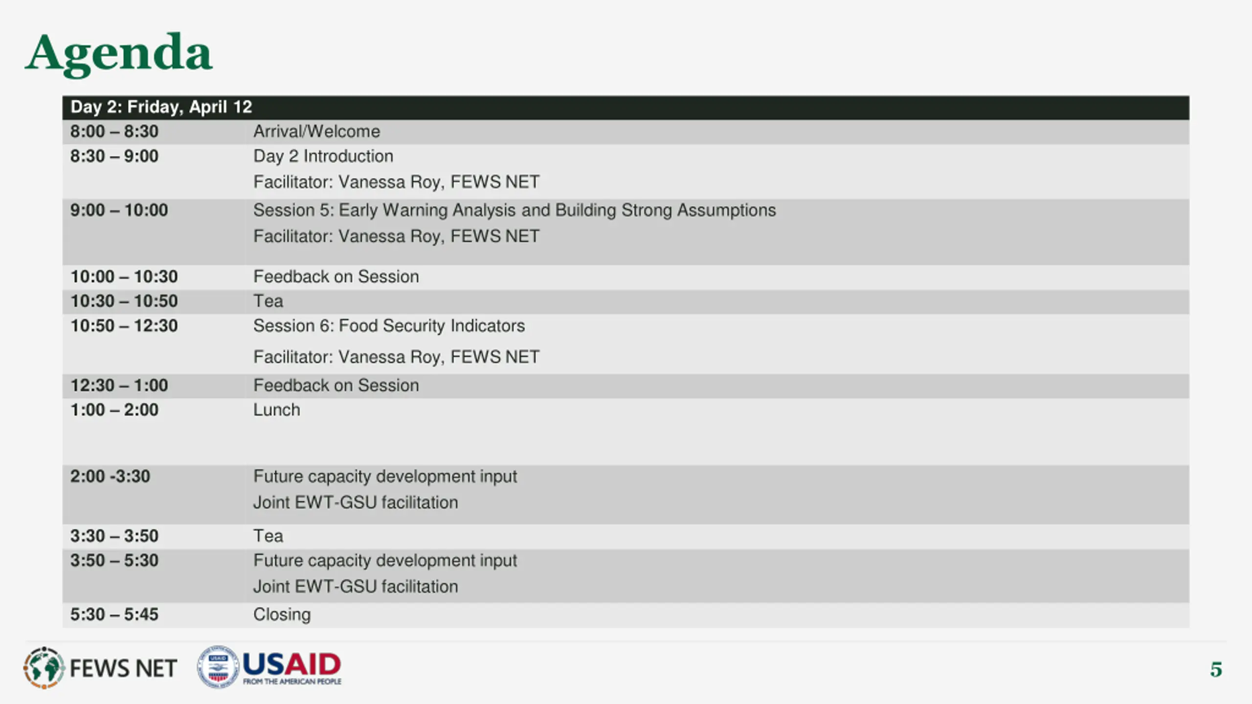 Agenda Day 2: Friday, April 12 8:00 8:30 8:30 9:00 Arrival/Welcome Day 2 Introduction Facilitator: Vanessa Roy, FEWS NET Session 5: Early Warning Analysis and Building Strong Assumptions Facilitator: Vanessa Roy, FEWS NET 9:00 10:00 Feedback on Session Tea Session 6: Food Security Indicators 10:00 10:30 10:30 10:50 10:50 12:30 Facilitator: Vanessa Roy, FEWS NET Feedback on Session Lunch 12:30 1:00 1:00 2:00 Future capacity development input Joint EWT-GSU facilitation 2:00 -3:30 Tea Future capacity development input Joint EWT-GSU facilitation Closing 3:30 3:50 3:50 5:30 5:30 5:45 5
