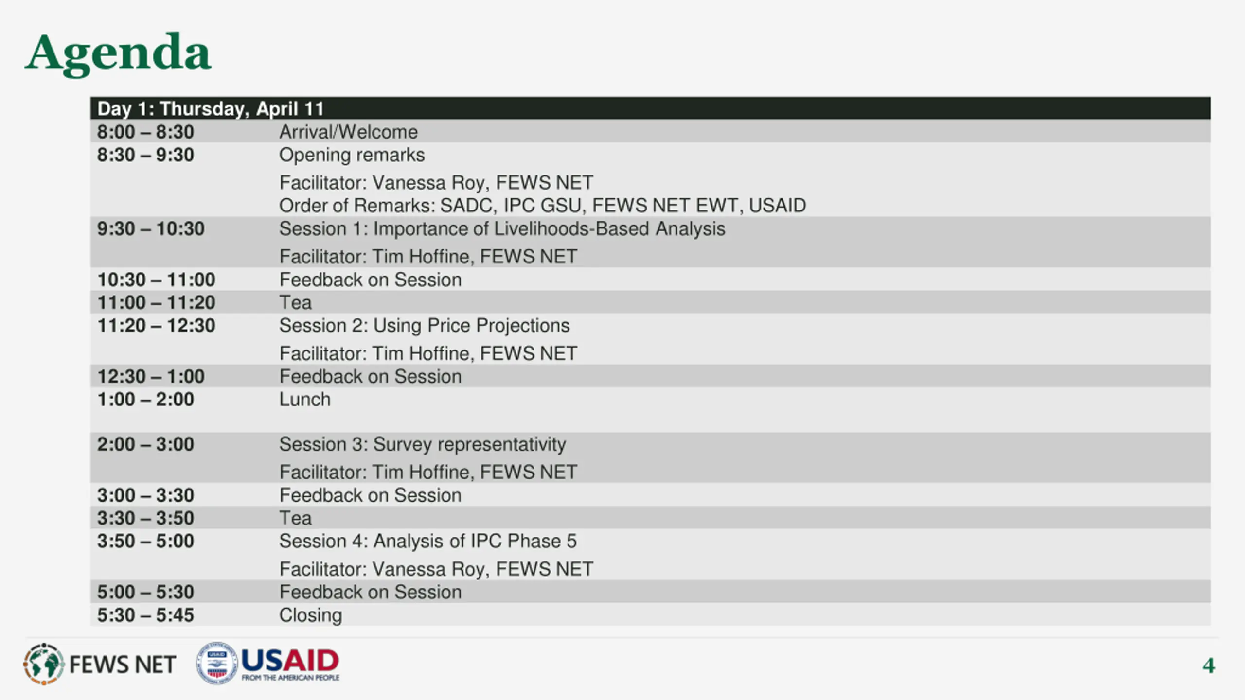Agenda Day 1: Thursday, April 11 8:00 8:30 8:30 9:30 Arrival/Welcome Opening remarks Facilitator: Vanessa Roy, FEWS NET Order of Remarks: SADC, IPC GSU, FEWS NET EWT, USAID Session 1: Importance of Livelihoods-Based Analysis Facilitator: Tim Hoffine, FEWS NET Feedback on Session Tea Session 2: Using Price Projections Facilitator: Tim Hoffine, FEWS NET Feedback on Session Lunch 9:30 10:30 10:30 11:00 11:00 11:20 11:20 12:30 12:30 1:00 1:00 2:00 Session 3: Survey representativity Facilitator: Tim Hoffine, FEWS NET Feedback on Session Tea Session 4: Analysis of IPC Phase 5 Facilitator: Vanessa Roy, FEWS NET Feedback on Session Closing 2:00 3:00 3:00 3:30 3:30 3:50 3:50 5:00 5:00 5:30 5:30 5:45 4