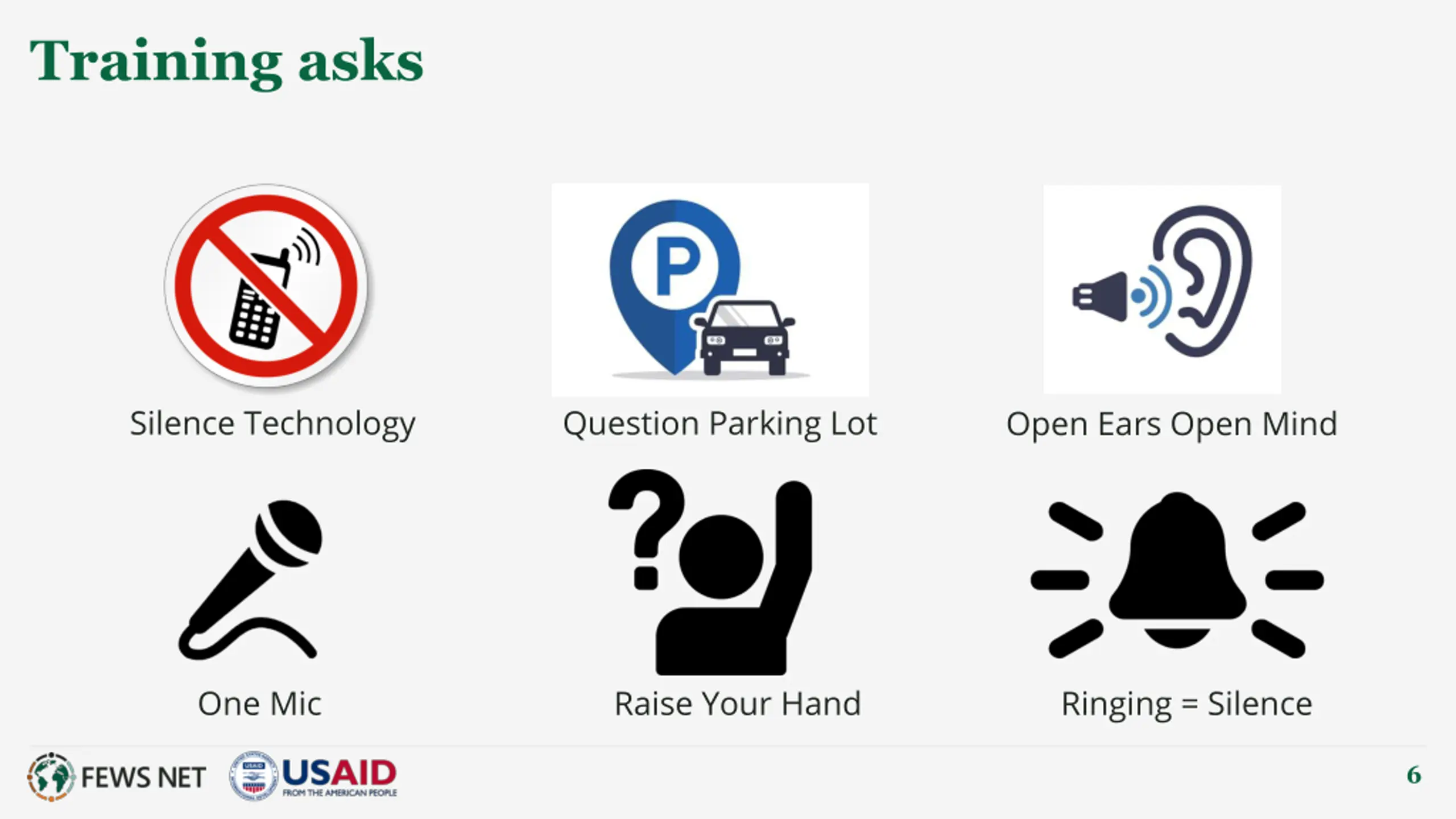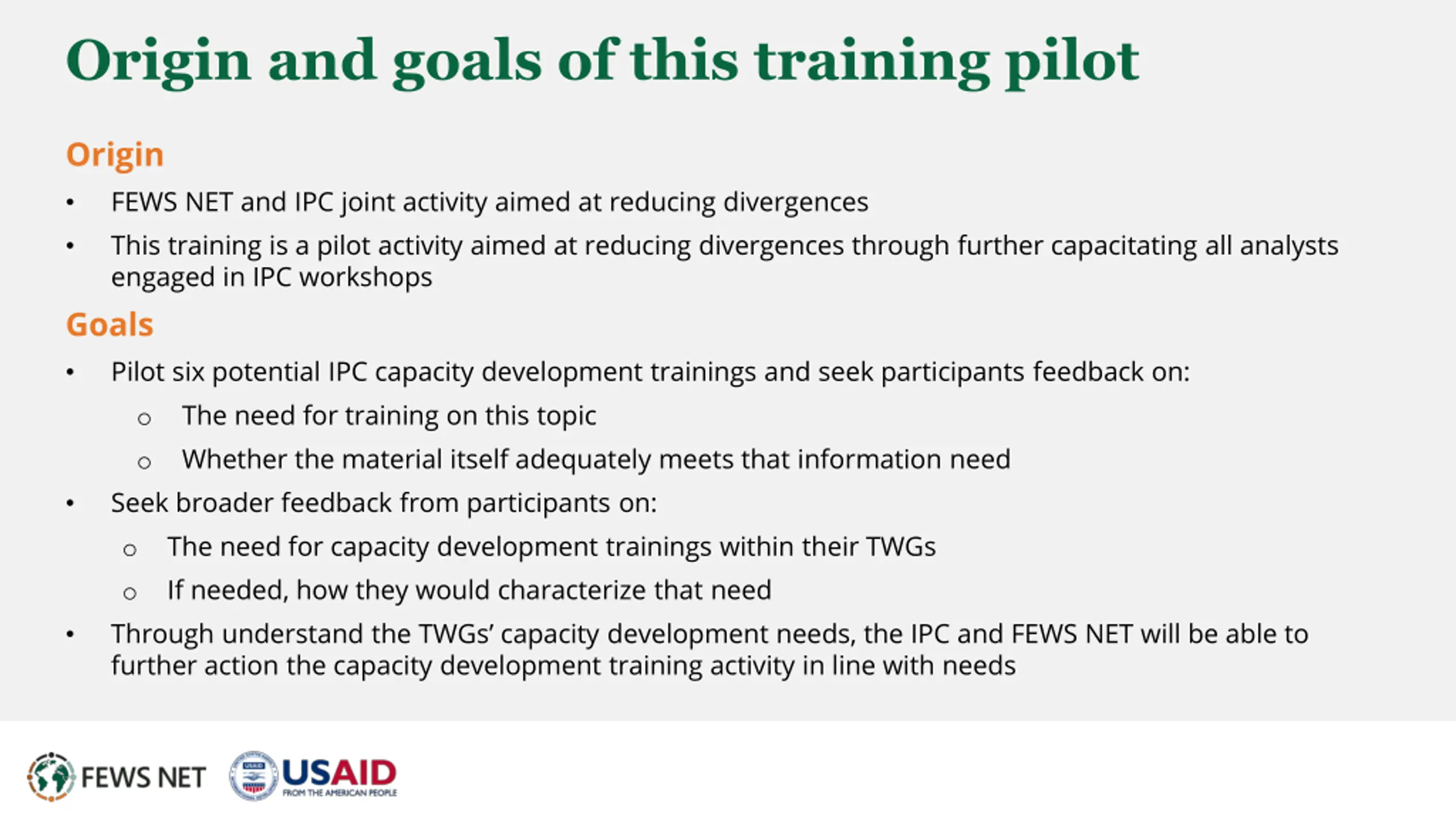 Origin and goals of this training pilot Origin FEWS NET and IPC joint activity aimed at reducing divergences This training is a pilot activity aimed at reducing divergences through further capacitating all analysts engaged in IPC workshops Goals Pilot six potential IPC capacity development trainings and seek participants feedback on: The need for training on this topic Whether the material itself adequately meets that information need Seek broader feedback from participants on: The need for capacity development trainings within their TWGs If needed, how they would characterize that need Through understand the TWGs capacity development needs, the IPC and FEWS NET will be able to further action the capacity development training activity in line with needs o o o o