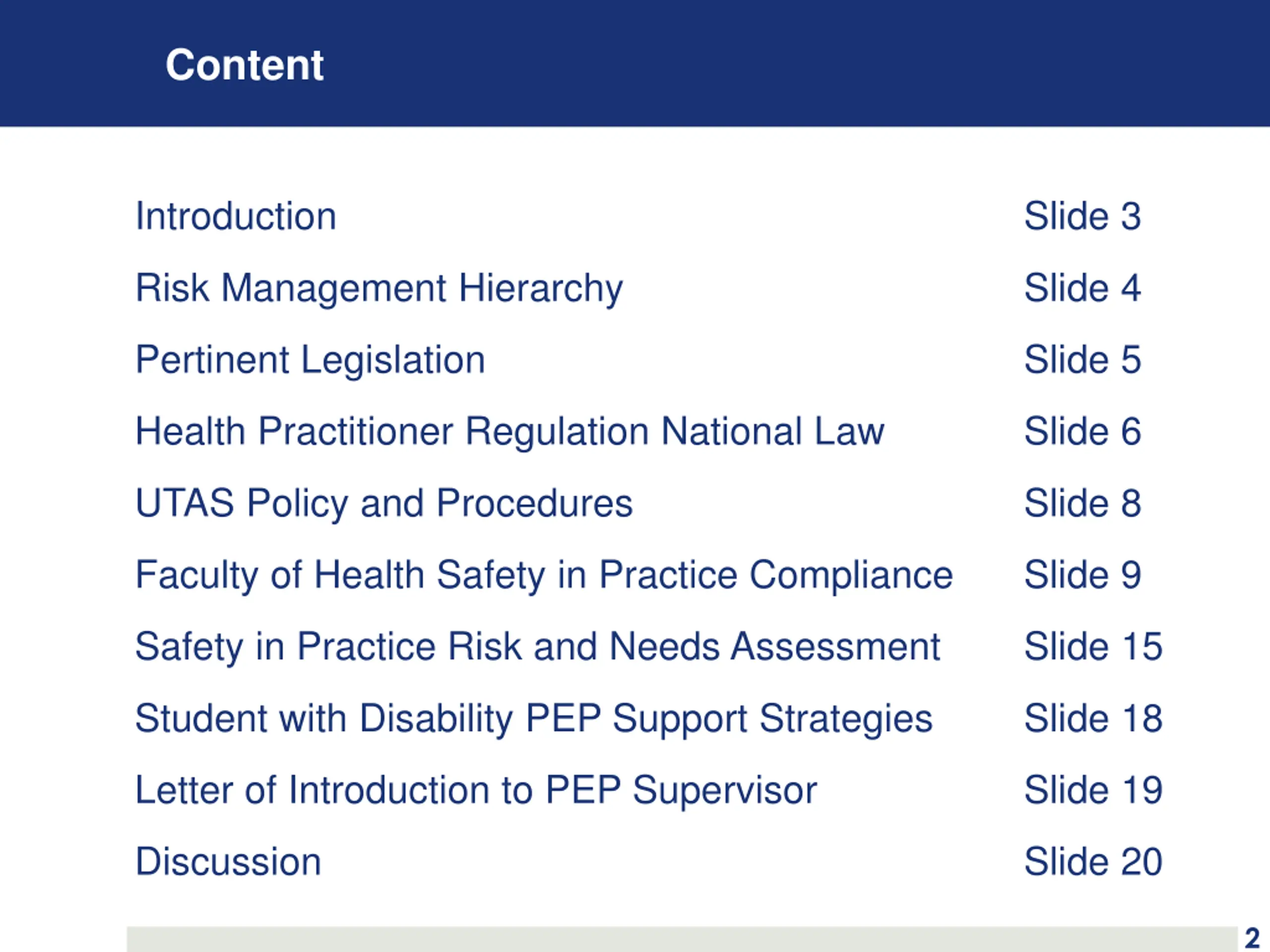 Content Introduction Slide 3 Risk Management Hierarchy Slide 4 Pertinent Legislation Slide 5 Health Practitioner Regulation National Law Slide 6 UTAS Policy and Procedures Slide 8 Faculty of Health Safety in Practice Compliance Slide 9 Safety in Practice Risk and Needs Assessment Slide 15 Student with Disability PEP Support Strategies Slide 18 Letter of Introduction to PEP Supervisor Slide 19 Discussion Slide 20 2