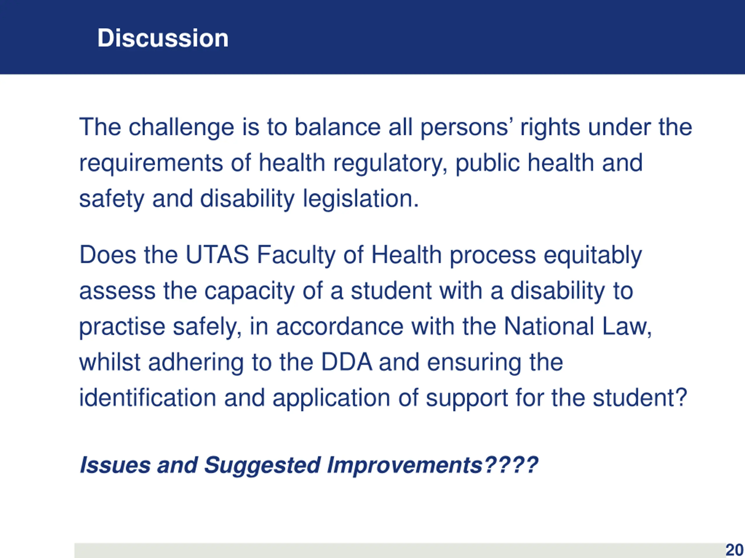 Discussion The challenge is to balance all persons rights under the requirements of health regulatory, public health and safety and disability legislation. Does the UTAS Faculty of Health process equitably assess the capacity of a student with a disability to practise safely, in accordance with the National Law, whilst adhering to the DDA and ensuring the identification and application of support for the student? Issues and Suggested Improvements???? 20