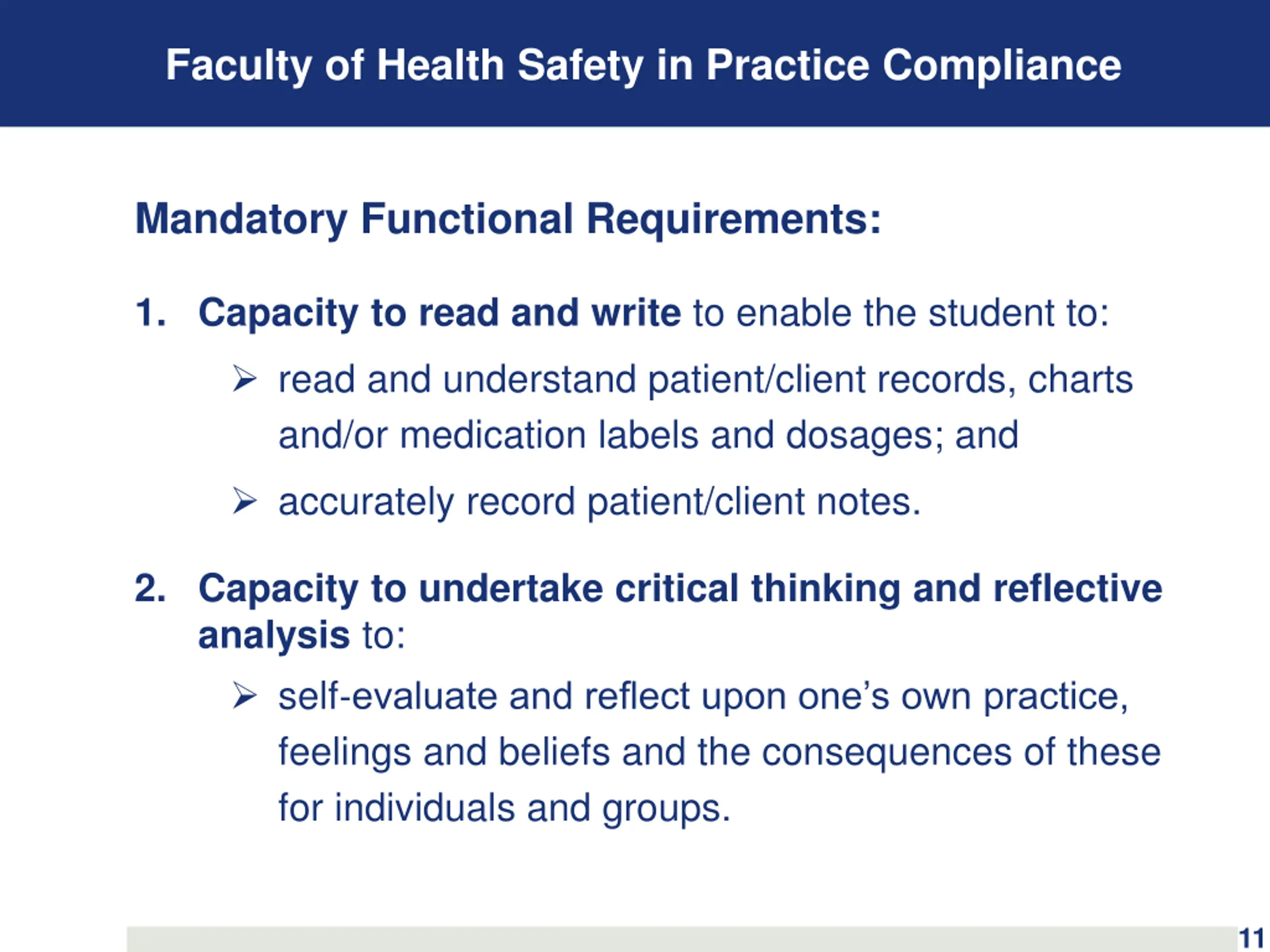 Faculty of Health Safety in Practice Compliance Mandatory Functional Requirements: 1. Capacity to read and write to enable the student to: read and understand patient/client records, charts and/or medication labels and dosages; and accurately record patient/client notes. 2. Capacity to undertake critical thinking and reflective analysis to: self evaluate and reflect upon one s own practice, feelings and beliefs and the consequences of these for individuals and groups. 11
