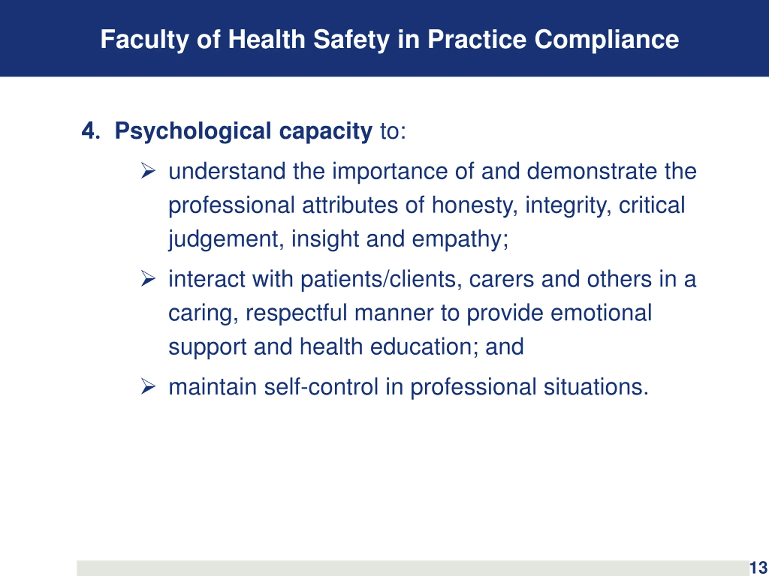 Faculty of Health Safety in Practice Compliance 4. Psychological capacity to: understand the importance of and demonstrate the professional attributes of honesty, integrity, critical judgement, insight and empathy; interact with patients/clients, carers and others in a caring, respectful manner to provide emotional support and health education; and maintain self-control in professional situations. 13