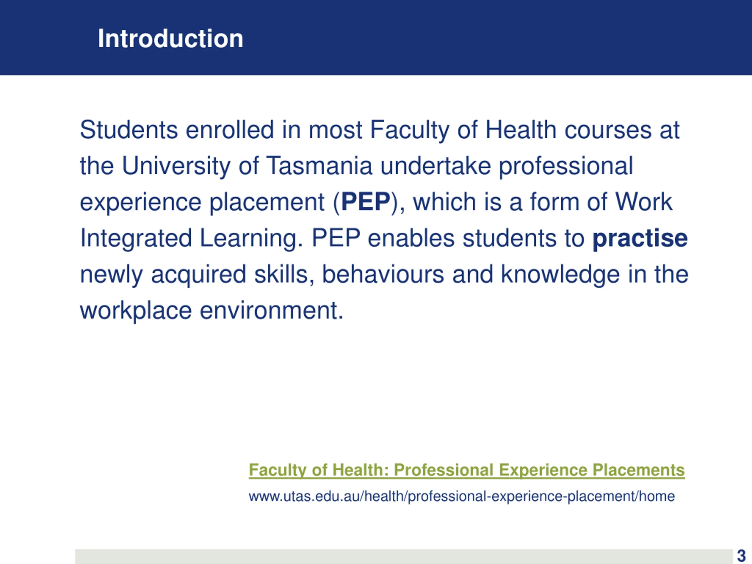 Introduction Students enrolled in most Faculty of Health courses at the University of Tasmania undertake professional experience placement (PEP), which is a form of Work Integrated Learning. PEP enables students to practise newly acquired skills, behaviours and knowledge in the workplace environment. Faculty of Health: Professional Experience Placements www.utas.edu.au/health/professional-experience-placement/home 3