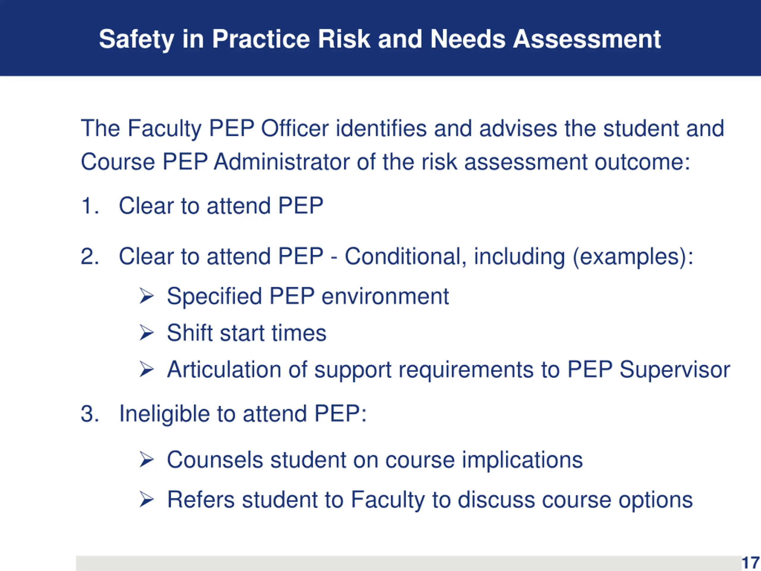 Safety in Practice Risk and Needs Assessment The Faculty PEP Officer assesses risk and support requirements via the following steps: Review of the student s: Safety in Practice Agreement; and Safe to Practice Health Assessment or Educational Psychological Assessment; and Disability Learning Access Plan (where one exists). Interview with the student as required. Consultation with Medical Practitioner as required. 16