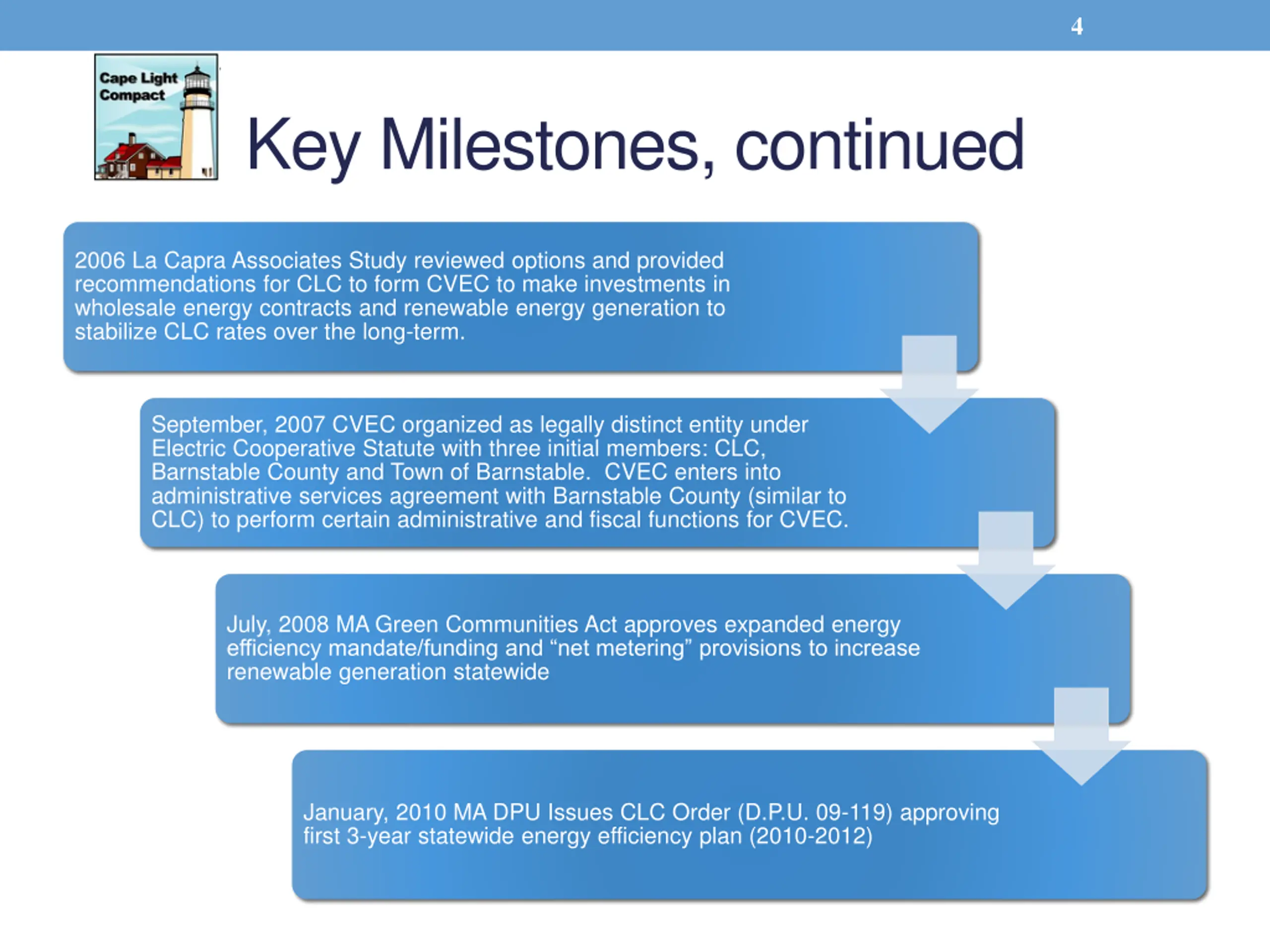 3 Key Milestones 1995 Barnstable County Energy Management Plan County Commissioners establish Barnstable County Energy Management Committee focus on importance of locally administering energy efficiency funds. 1997 MA Electric Industry Restructuring Act - with Town Meeting/Town Council approval formed CLC through inter-governmental agreement. CLC authorized to aggregate electric customers in an opt-out power supply contract and administer energy efficiency programs in conjunction with power supply. 2000 Cape Light Compact Municipal Aggregation Plan Filed with DTE. CLC consulted with DOER on the preparation of and public hearings held to develop the Aggregation Plan. CLC enters into an administrative services agreement with Barnstable County to provide administrative and fiscal functions for CLC. July, 2001 CLC s first Energy Efficiency Plan approved by DTE Implementation Begins. March, 2005 Customer Choice Opt-out Competitive Power Supply Offering CLC began serving all electric customer classes. RFP was issued in 2004 to select vendor to provide retail electric supply to all customers classes.