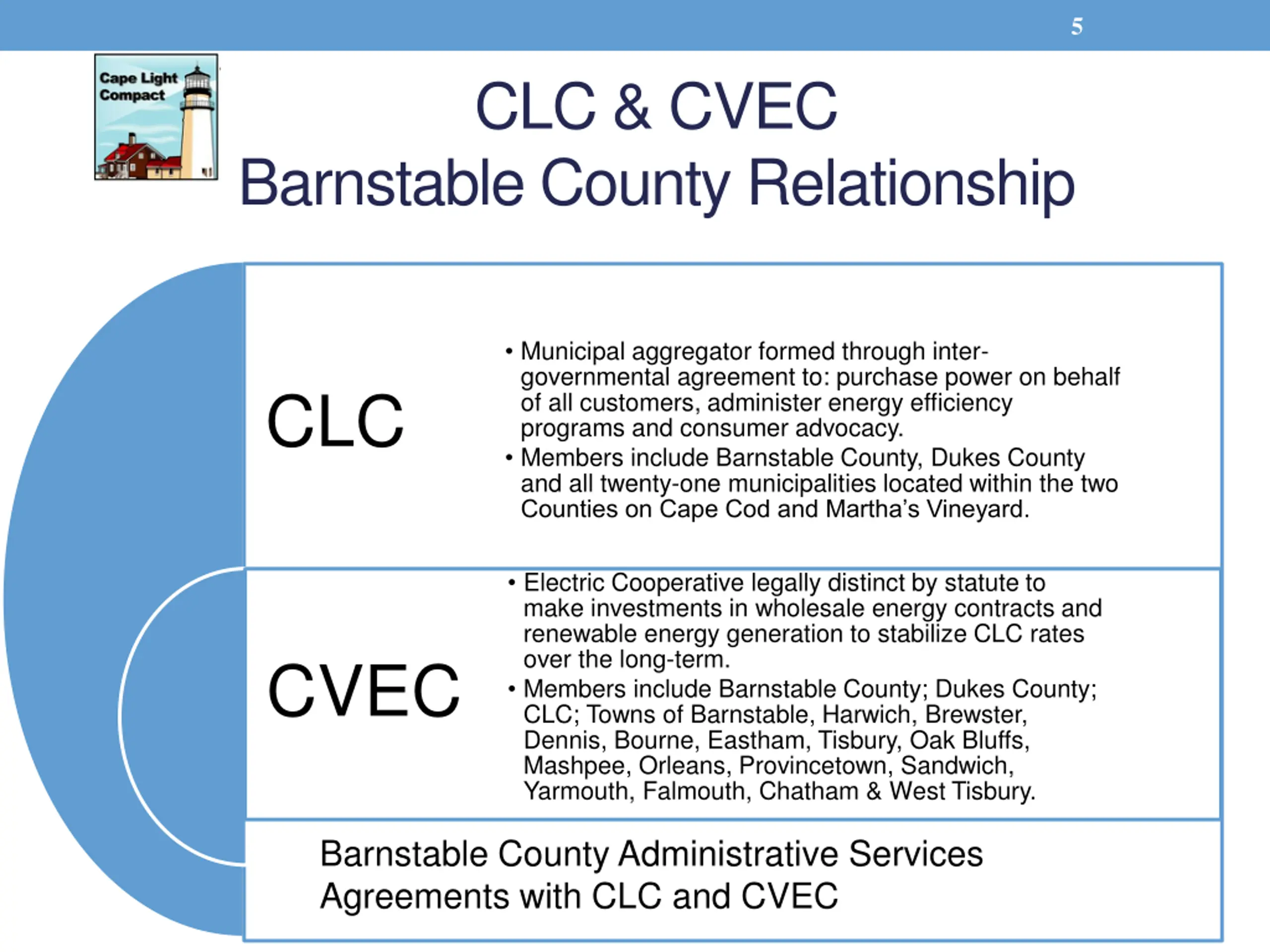 5 CLC & CVEC Barnstable County Relationship Municipal aggregator formed through inter- governmental agreement to: purchase power on behalf of all customers, administer energy efficiency programs and consumer advocacy. Members include Barnstable County, Dukes County and all twenty-one municipalities located within the two Counties on Cape Cod and Martha s Vineyard. CLC Electric Cooperative legally distinct by statute to make investments in wholesale energy contracts and renewable energy generation to stabilize CLC rates over the long-term. Members include Barnstable County; Dukes County; CLC; Towns of Barnstable, Harwich, Brewster, Dennis, Bourne, Eastham, Tisbury, Oak Bluffs, Mashpee, Orleans, Provincetown, Sandwich, Yarmouth, Falmouth, Chatham & West Tisbury. CVEC Barnstable County Administrative Services Agreements with CLC and CVEC
