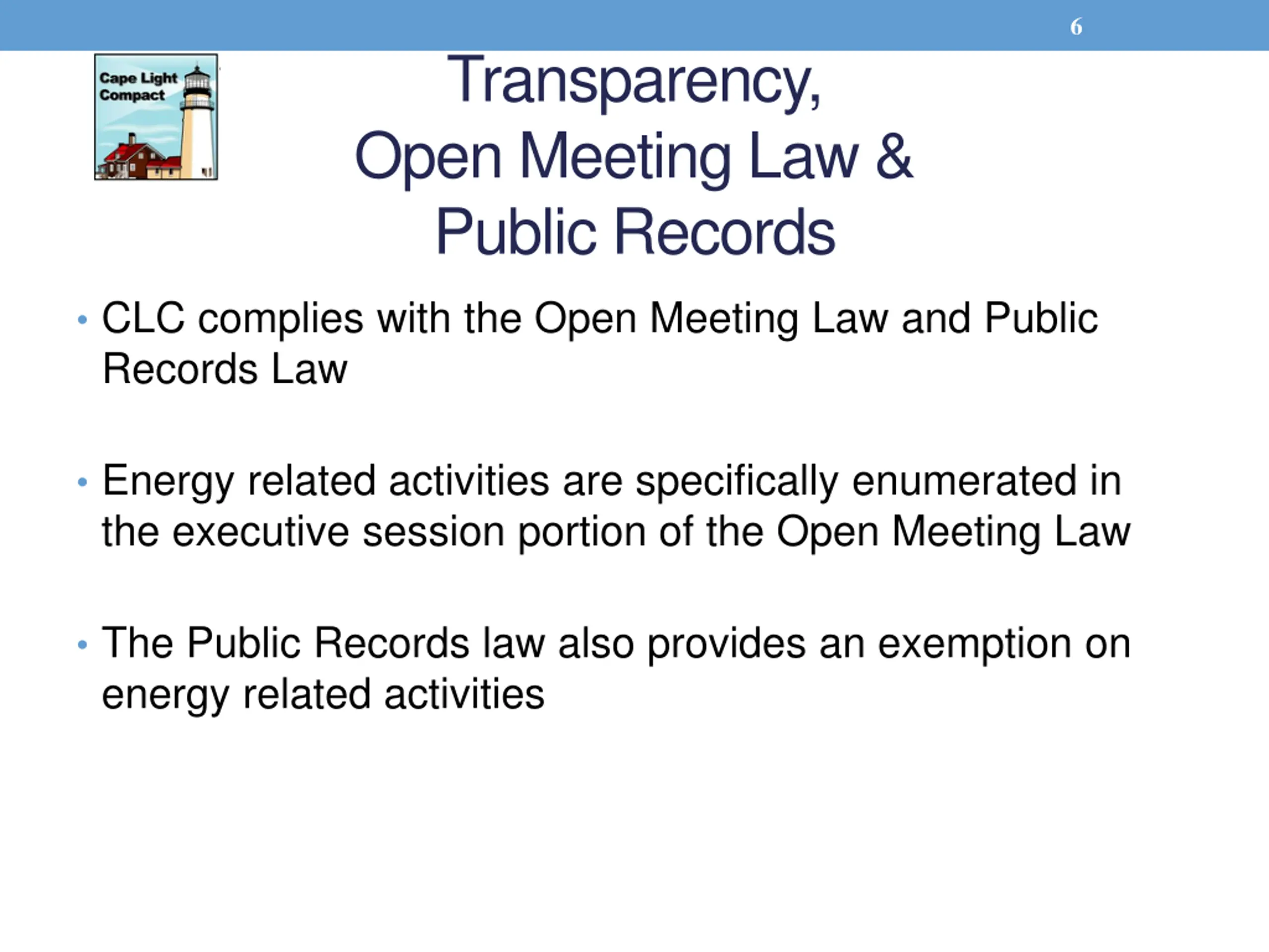 6 Transparency, Open Meeting Law & Public Records CLC complies with the Open Meeting Law and Public Records Law Energy related activities are specifically enumerated in the executive session portion of the Open Meeting Law The Public Records law also provides an exemption on energy related activities