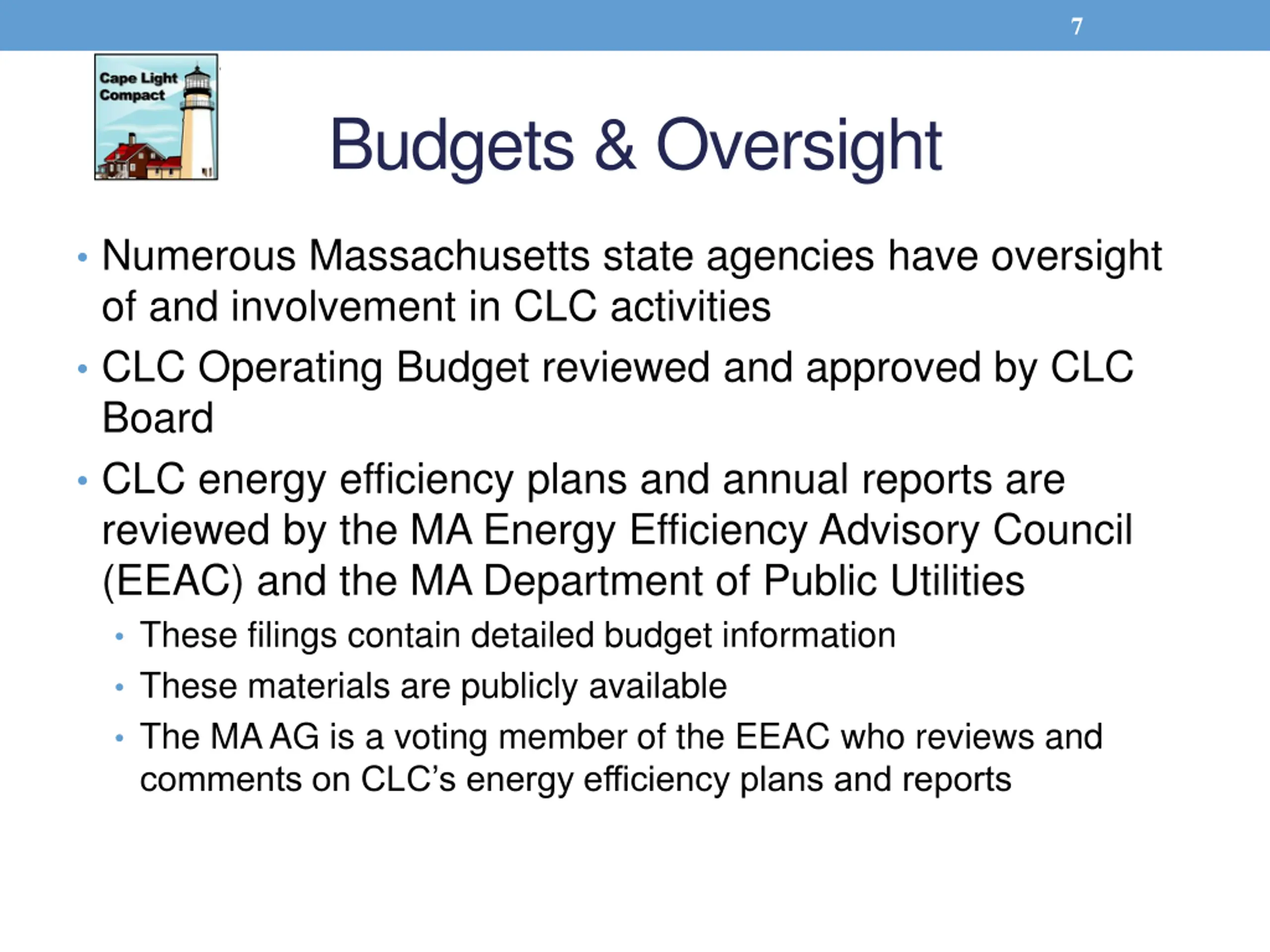 7 Budgets & Oversight Numerous Massachusetts state agencies have oversight of and involvement in CLC activities CLC Operating Budget reviewed and approved by CLC Board CLC energy efficiency plans and annual reports are reviewed by the MA Energy Efficiency Advisory Council (EEAC) and the MA Department of Public Utilities These filings contain detailed budget information These materials are publicly available The MA AG is a voting member of the EEAC who reviews and comments on CLC s energy efficiency plans and reports