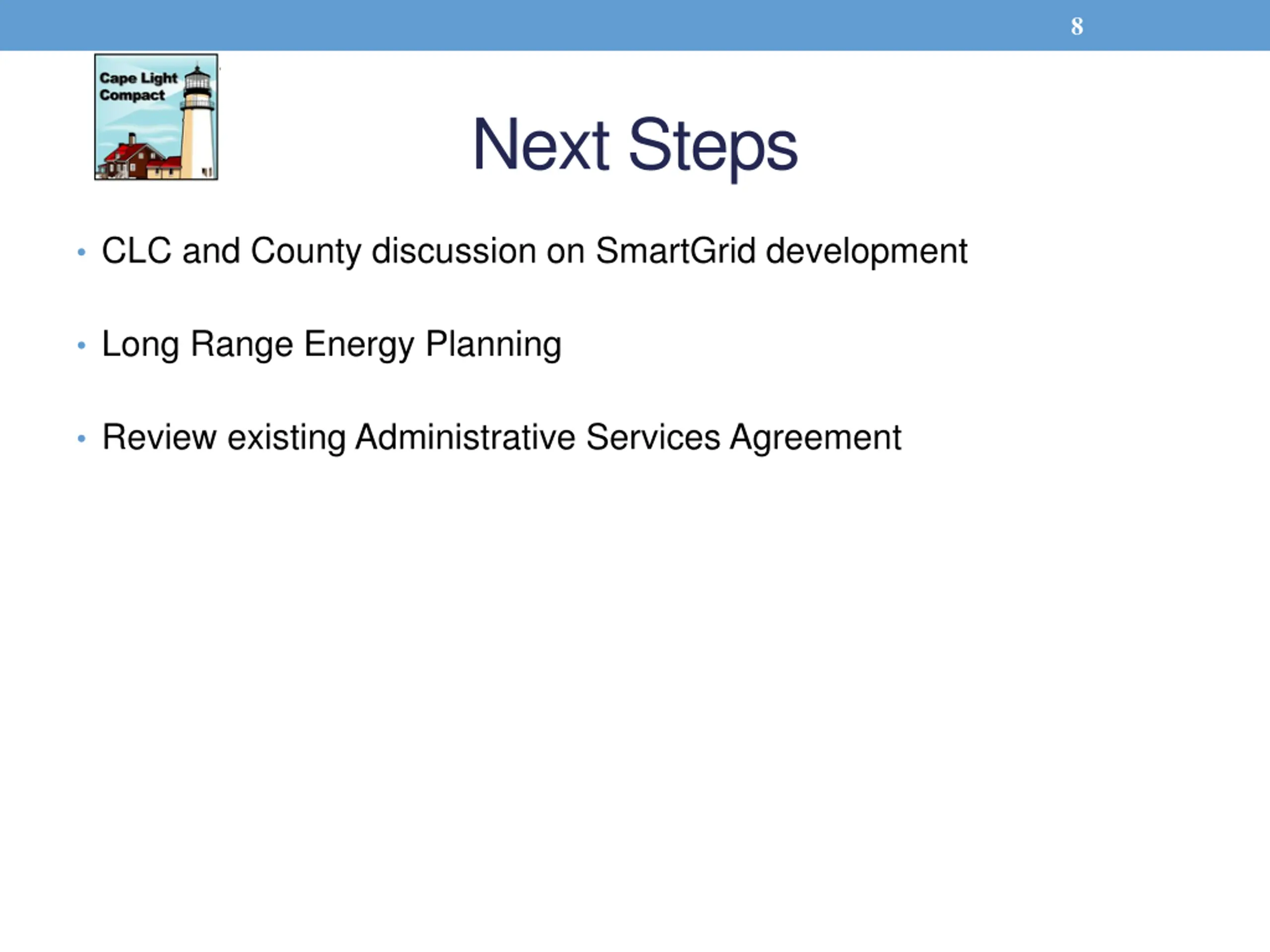 8 Next Steps CLC and County discussion on SmartGrid development Long Range Energy Planning Review existing Administrative Services Agreement