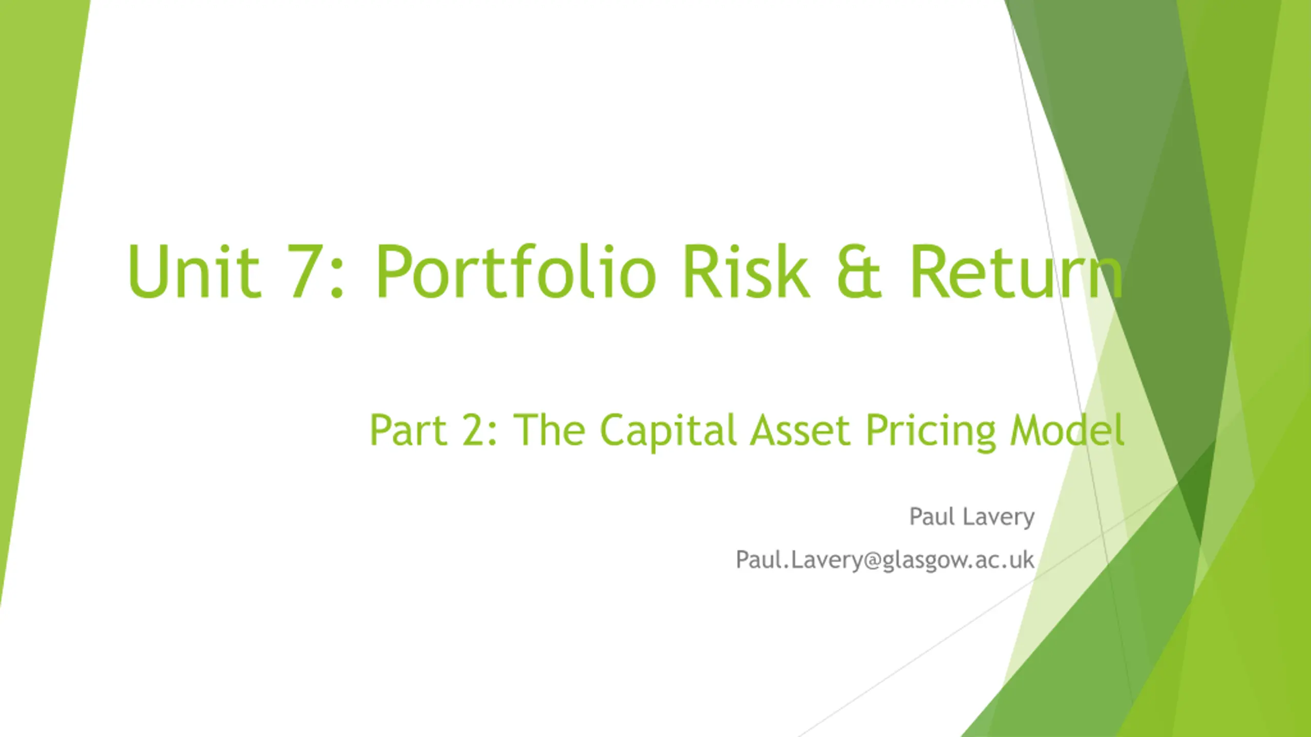 Unit 7: Portfolio Risk & Return Part 2: The Capital Asset Pricing Model Paul Lavery Paul.Lavery@glasgow.ac.uk
