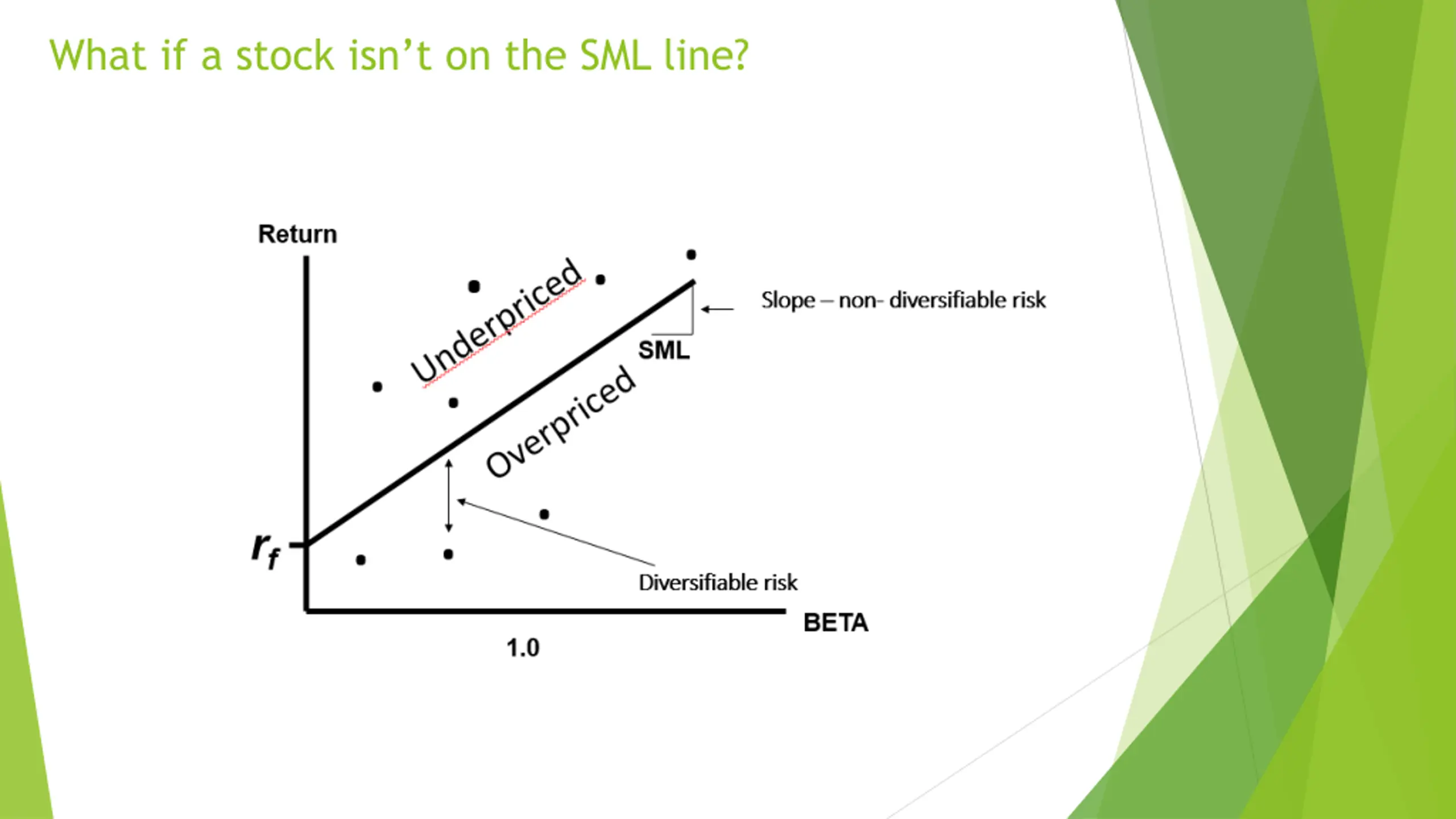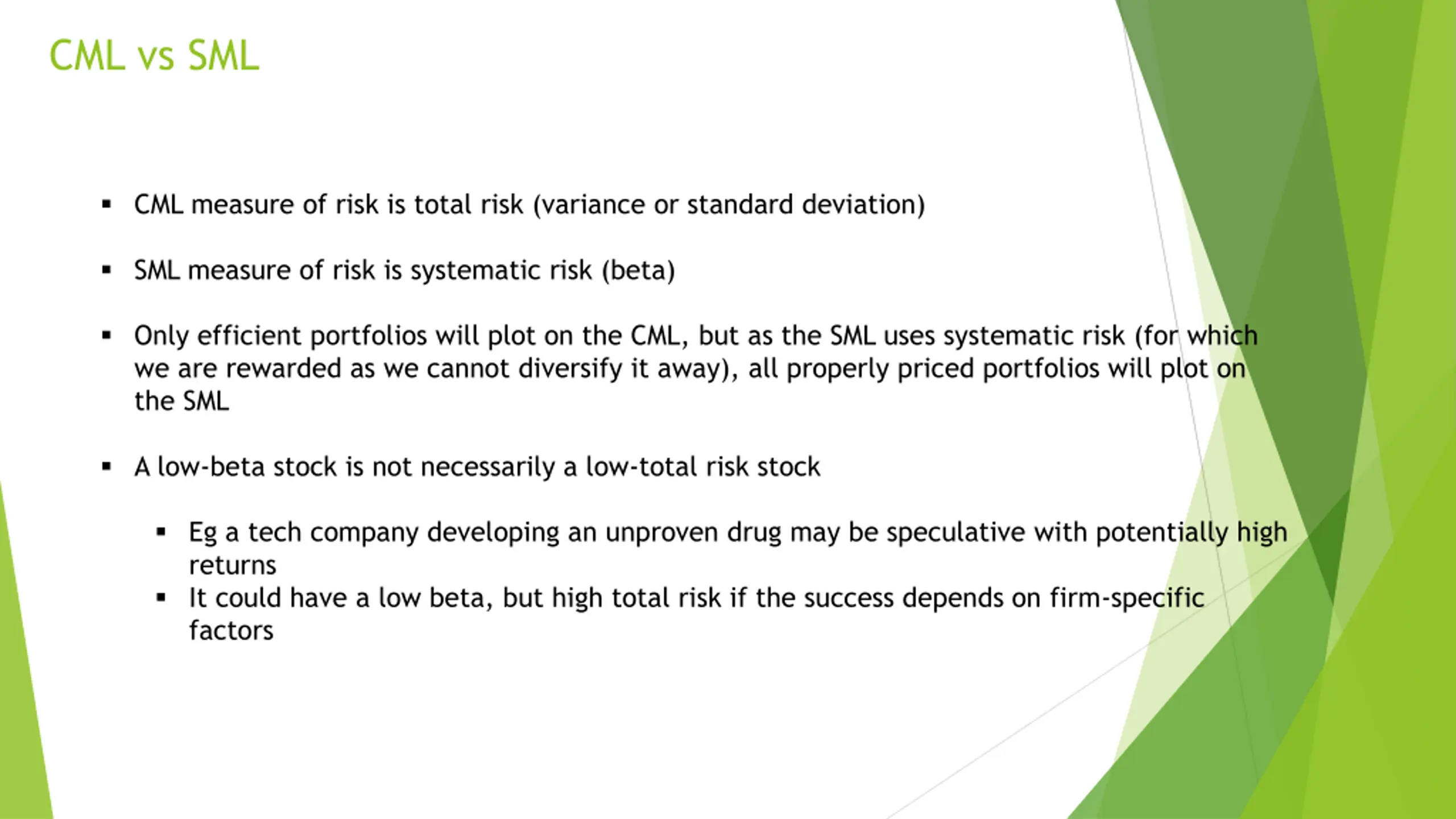 CML vs SML CML measure of risk is total risk (variance or standard deviation) SML measure of risk is systematic risk (beta) Only efficient portfolios will plot on the CML, but as the SML uses systematic risk (for which we are rewarded as we cannot diversify it away), all properly priced portfolios will plot on the SML A low-beta stock is not necessarily a low-total risk stock Eg a tech company developing an unproven drug may be speculative with potentially high returns It could have a low beta, but high total risk if the success depends on firm-specific factors