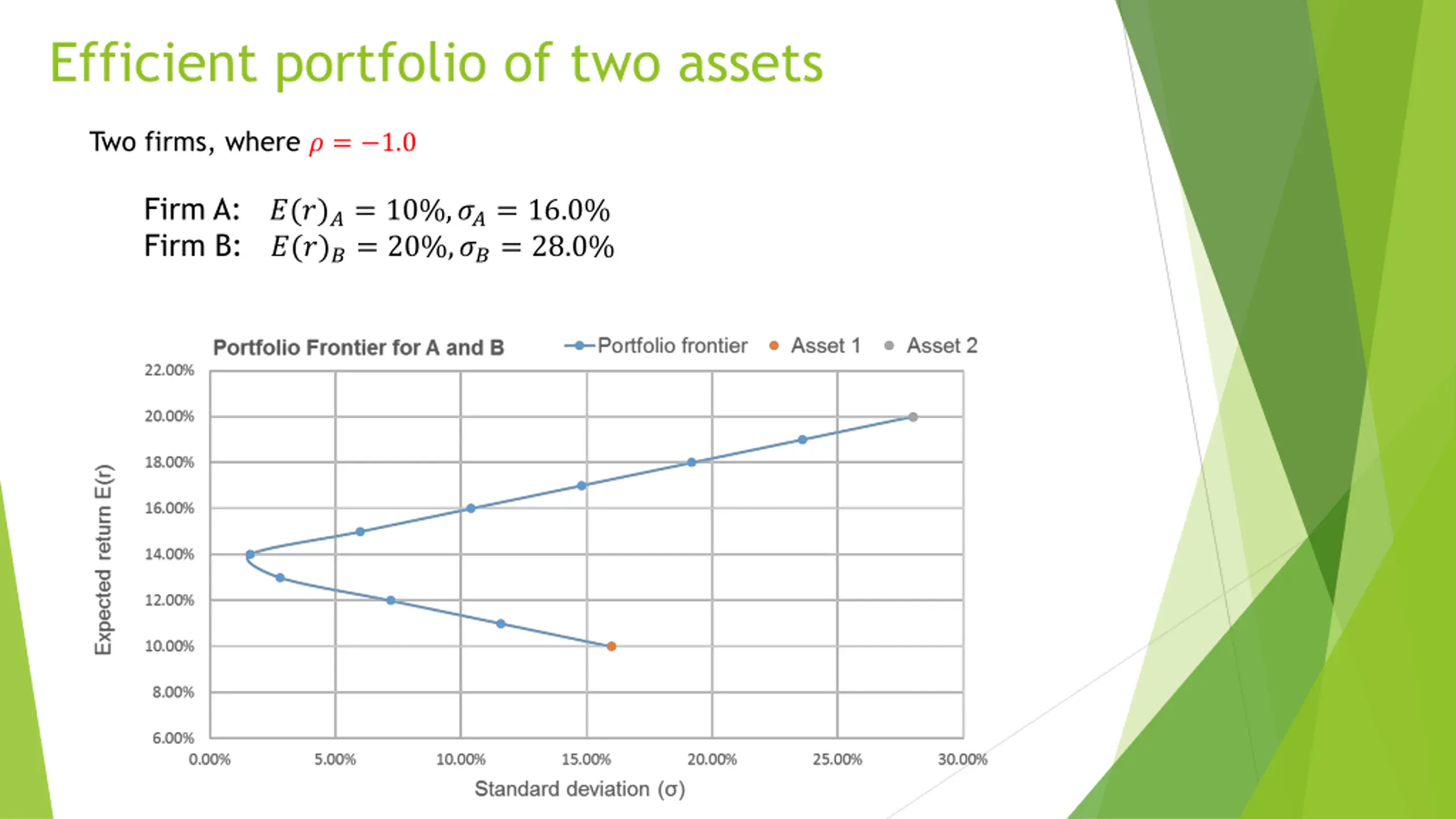 Efficient portfolio of two assets Two firms, where ? = 1.0 Firm A: ?(?)?= 10%,??= 16.0% Firm B: ?(?)?= 20%,??= 28.0%