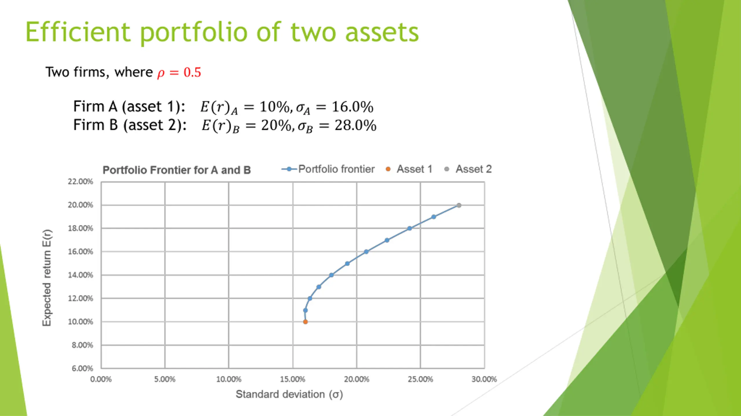 Efficient portfolio of two assets Two firms, where ? = 0.5 Firm A (asset 1): ?(?)?= 10%,??= 16.0% Firm B (asset 2): ?(?)?= 20%,??= 28.0%