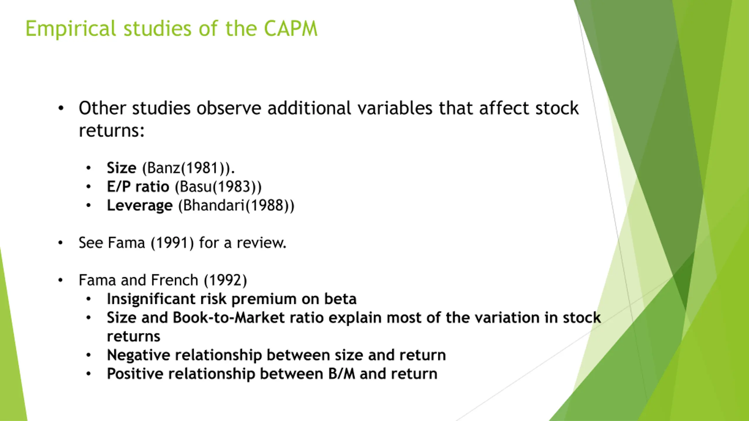 Empirical studies of the CAPM Other studies observe additional variables that affect stock returns: Size (Banz(1981)). E/P ratio (Basu(1983)) Leverage (Bhandari(1988)) See Fama (1991) for a review. Fama and French (1992) Insignificant risk premium on beta Size and Book-to-Market ratio explain most of the variation in stock returns Negative relationship between size and return Positive relationship between B/M and return