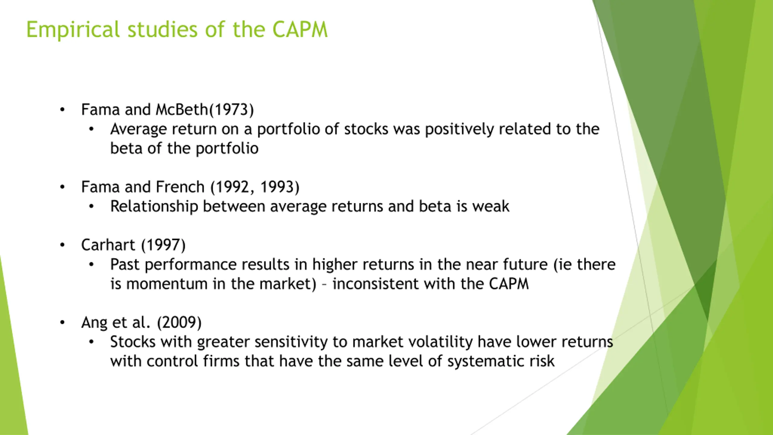 Empirical studies of the CAPM Fama and McBeth(1973) Average return on a portfolio of stocks was positively related to the beta of the portfolio Fama and French (1992, 1993) Relationship between average returns and beta is weak Carhart (1997) Past performance results in higher returns in the near future (ie there is momentum in the market) inconsistent with the CAPM Ang et al. (2009) Stocks with greater sensitivity to market volatility have lower returns with control firms that have the same level of systematic risk
