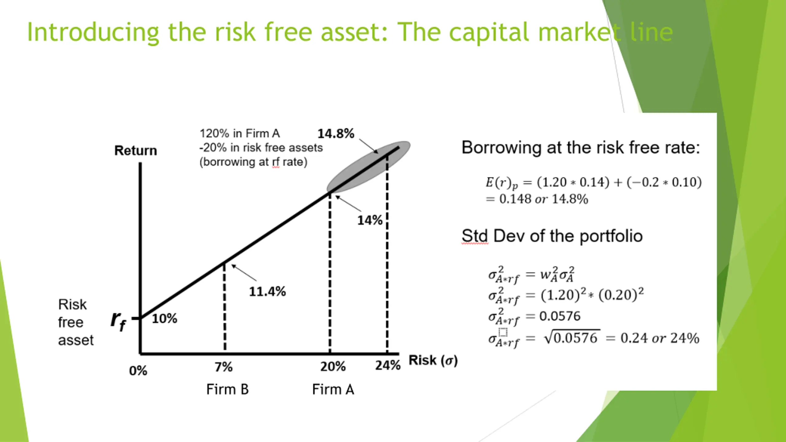 Introducing the risk free asset: The capital market line Firm B Firm A
