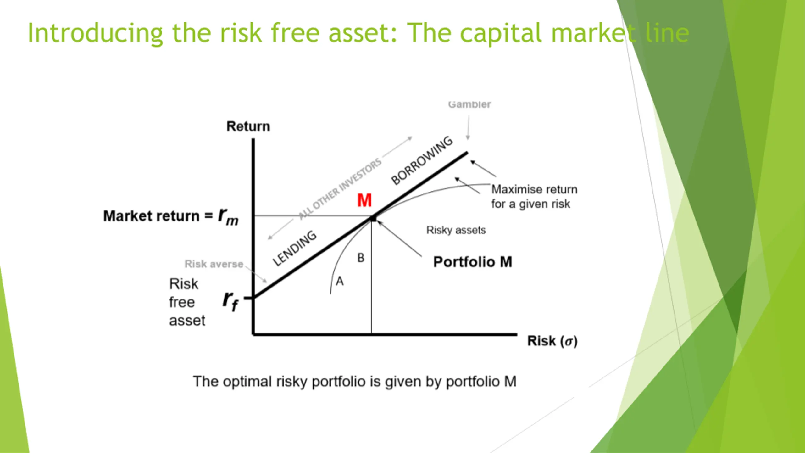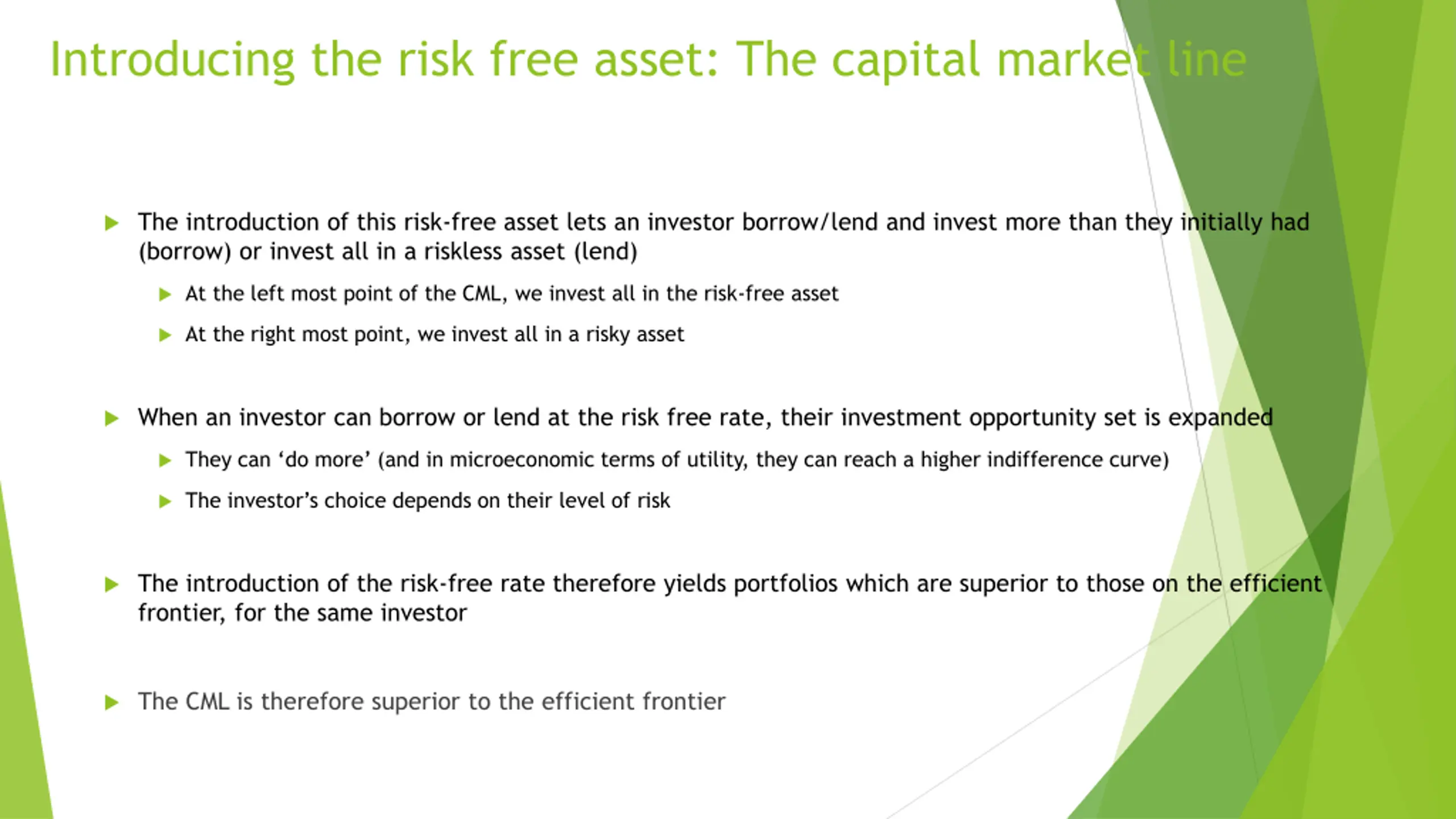 Introducing the risk free asset: The capital market line A new possibility opens up when we introduce the risk-free asset, such as a government bonds, whose risk we assume to be zero This opens up new possibilities to an investor They can invest in a risky portfolio and a risk-free asset They can now borrow at the risk free rate and invest more than they had to begin with This linear relationship is shown through the Capital Market Line (CML)