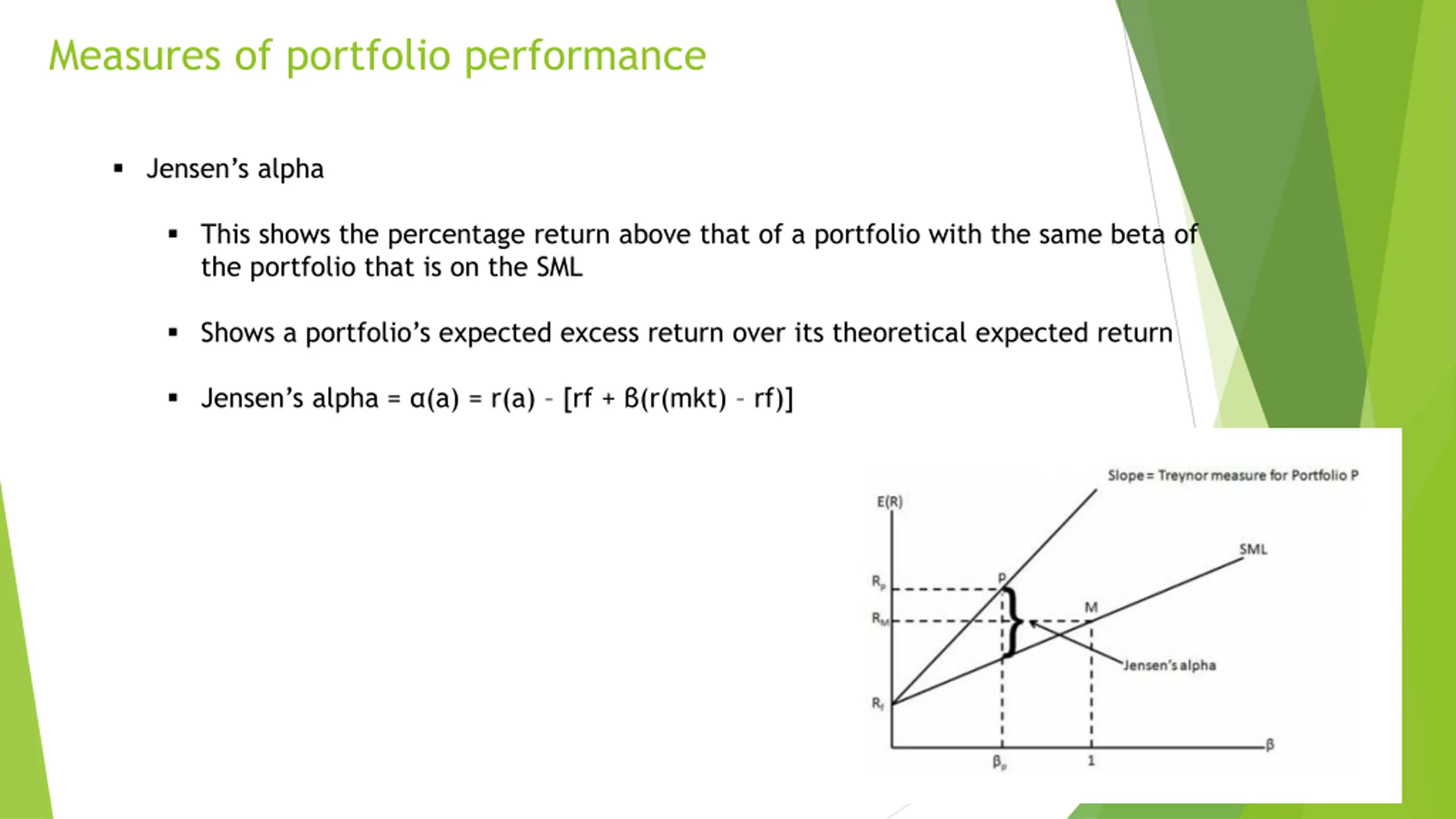 Measures of portfolio performance Jensen s alpha This shows the percentage return above that of a portfolio with the same beta of the portfolio that is on the SML Shows a portfolio s expected excess return over its theoretical expected return Jensen s alpha = (a) = r(a) [rf + (r(mkt) rf)]