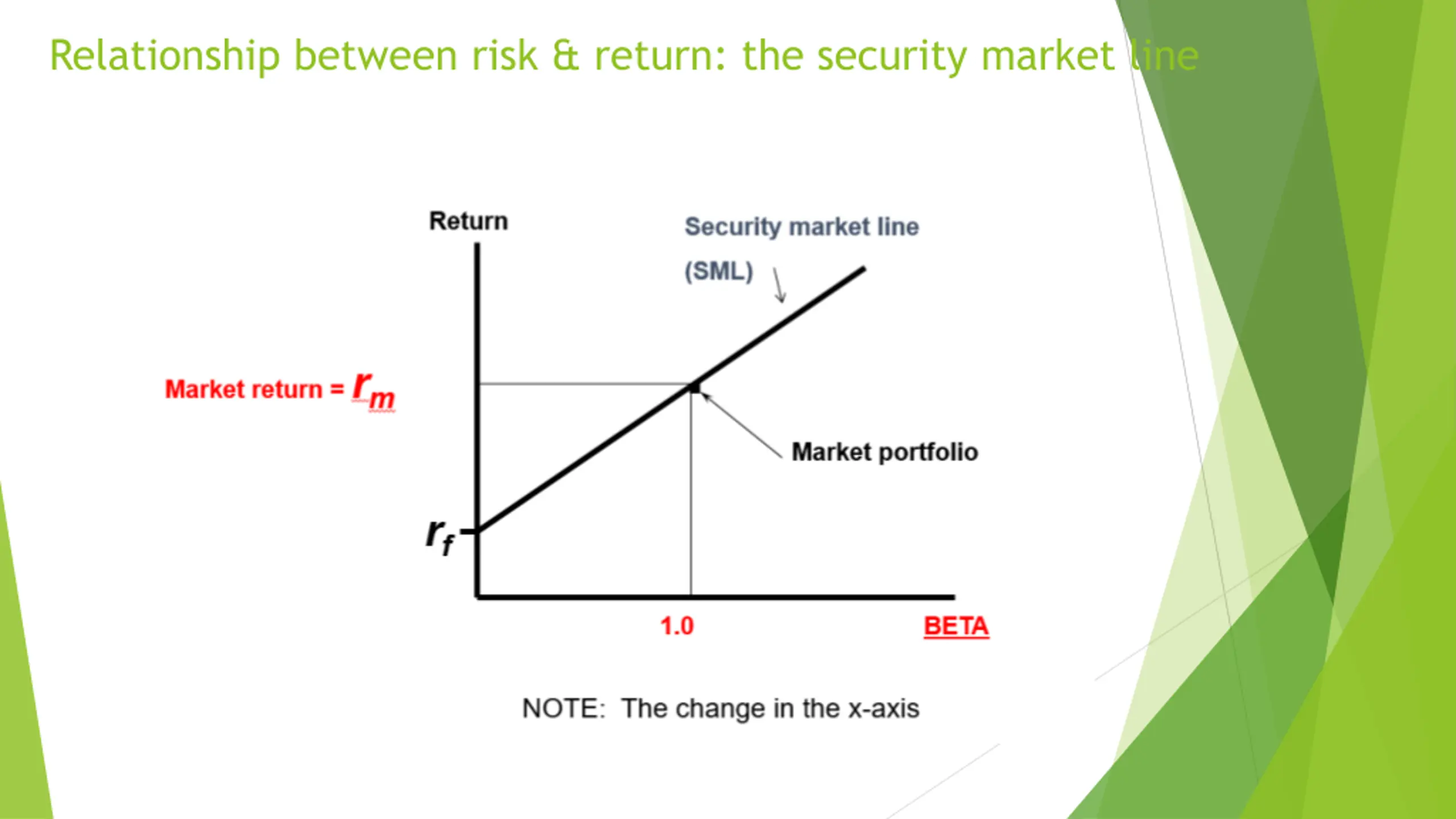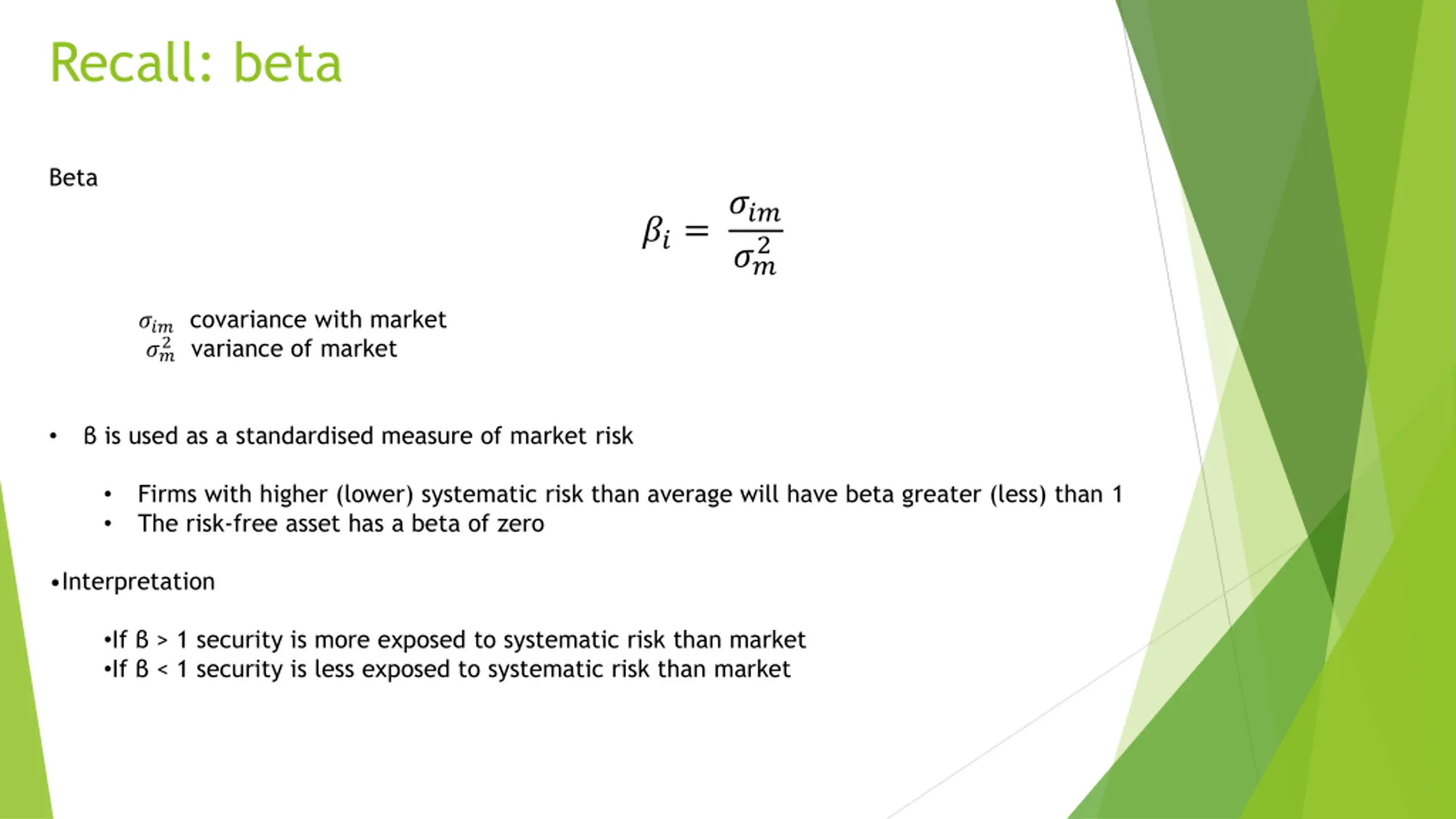 Recall: beta Beta ??? ?? ??= 2 ??? covariance with market ?? 2 variance of market is used as a standardised measure of market risk Firms with higher (lower) systematic risk than average will have beta greater (less) than 1 The risk-free asset has a beta of zero Interpretation If > 1 security is more exposed to systematic risk than market If < 1 security is less exposed to systematic risk than market