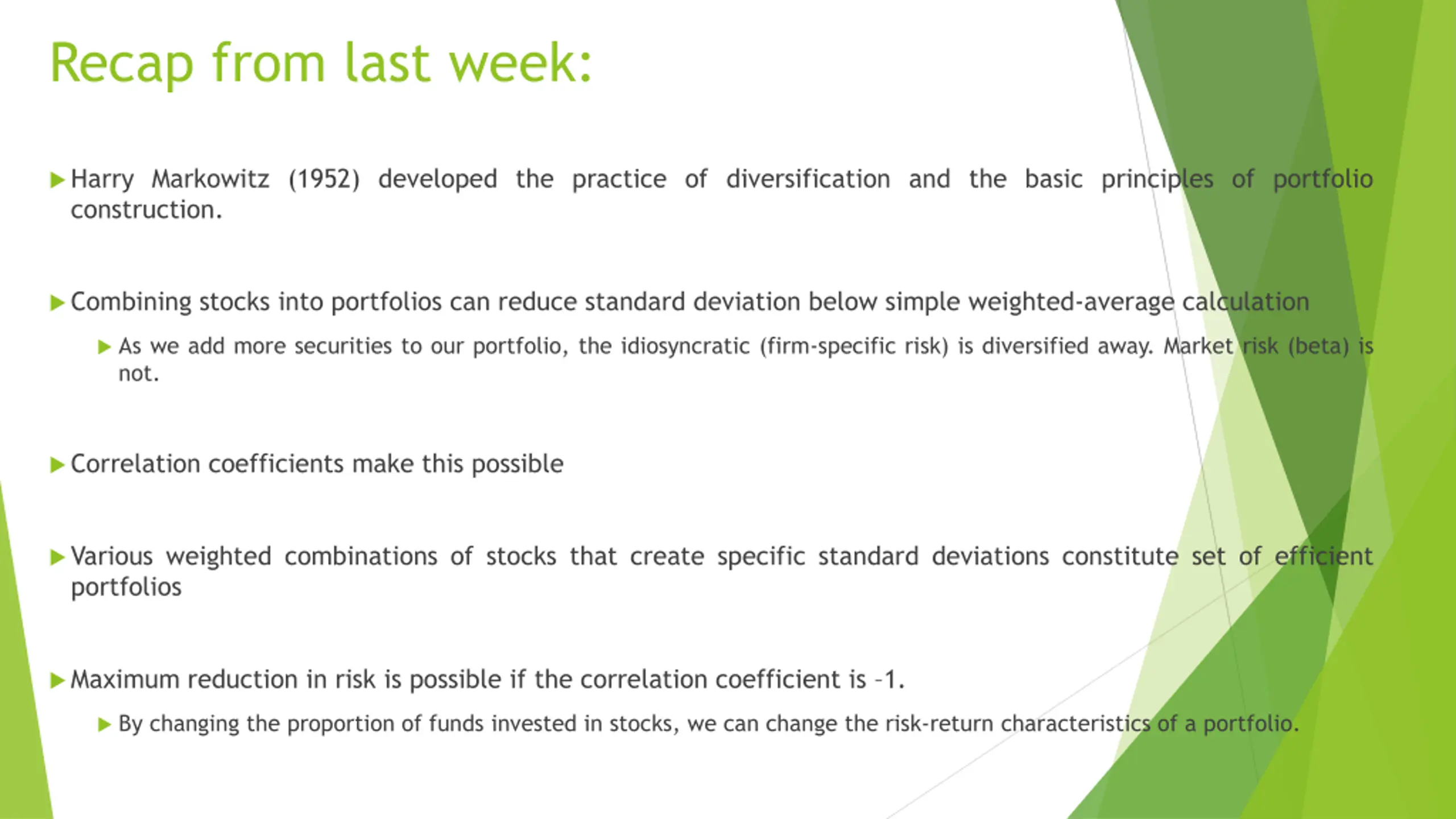 Recap from last week: Harry Markowitz (1952) developed the practice of diversification and the basic principles of portfolio construction. Combining stocks into portfolios can reduce standard deviation below simple weighted-average calculation As we add more securities to our portfolio, the idiosyncratic (firm-specific risk) is diversified away. Market risk (beta) is not. Correlation coefficients make this possible Various weighted combinations of stocks that create specific standard deviations constitute set of efficient portfolios Maximum reduction in risk is possible if the correlation coefficient is 1. By changing the proportion of funds invested in stocks, we can change the risk-return characteristics of a portfolio.