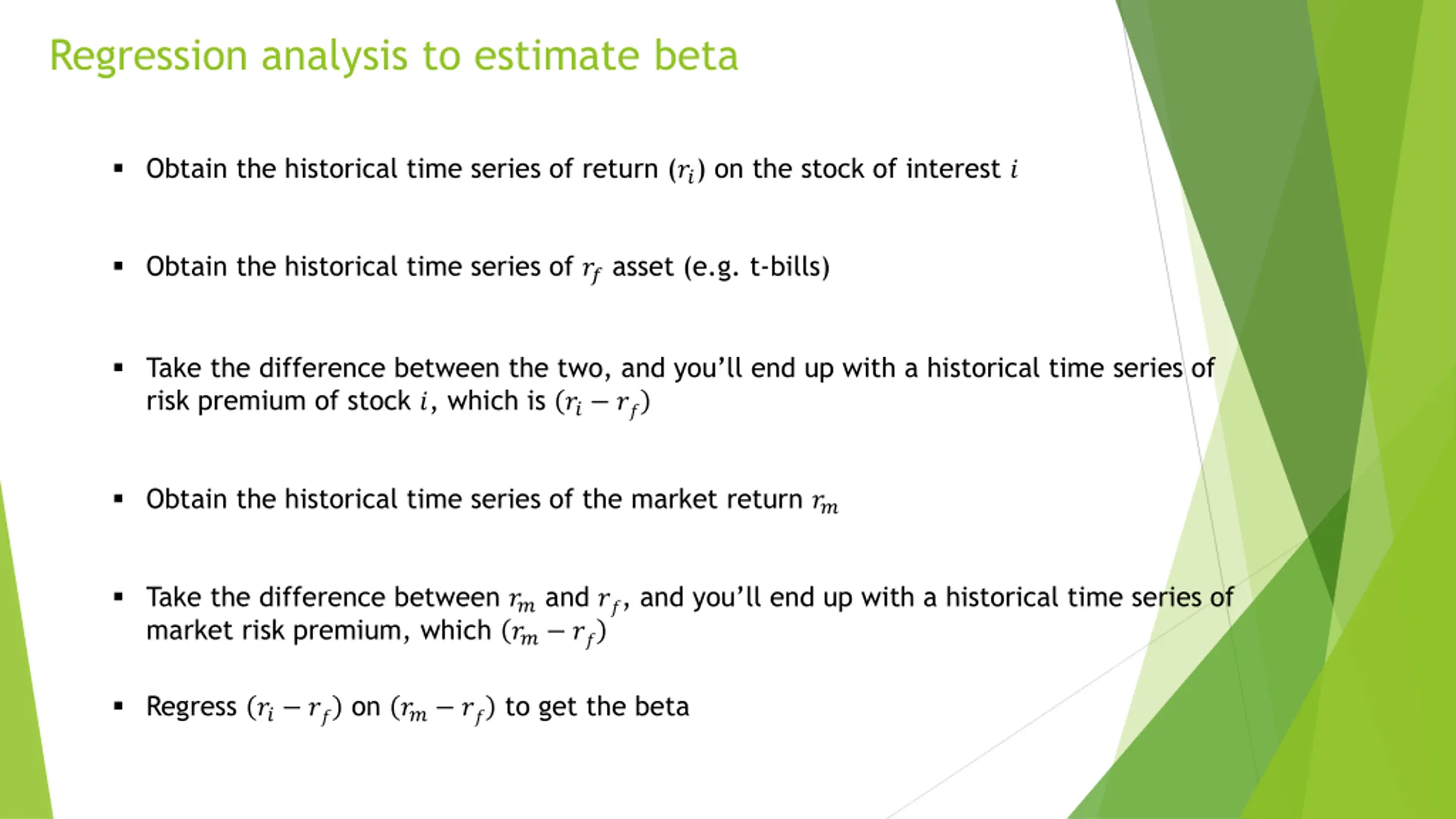 Regression analysis to estimate beta Obtain the historical time series of return (??) on the stock of interest ? Obtain the historical time series of ?? asset (e.g. t-bills) Take the difference between the two, and you ll end up with a historical time series of risk premium of stock ?, which is ?? ?? Obtain the historical time series of the market return ?? Take the difference between ?? and ??, and you ll end up with a historical time series of market risk premium, which ?? ?? Regress ?? ?? on ?? ?? to get the beta