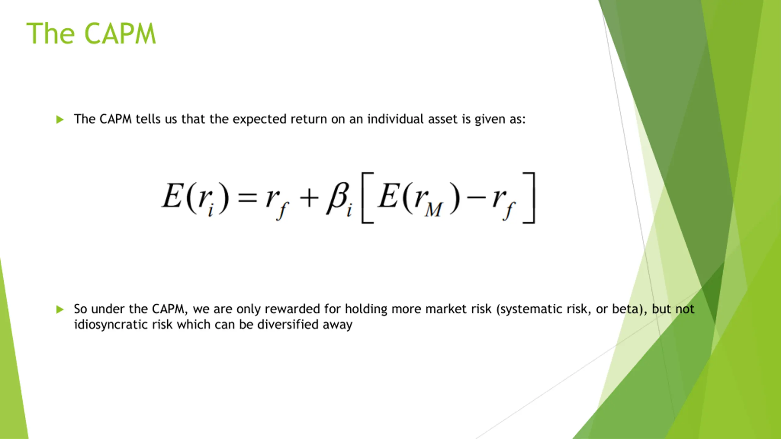 The CAPM The CAPM tells us that the expected return on an individual asset is given as: So under the CAPM, we are only rewarded for holding more market risk (systematic risk, or beta), but not idiosyncratic risk which can be diversified away