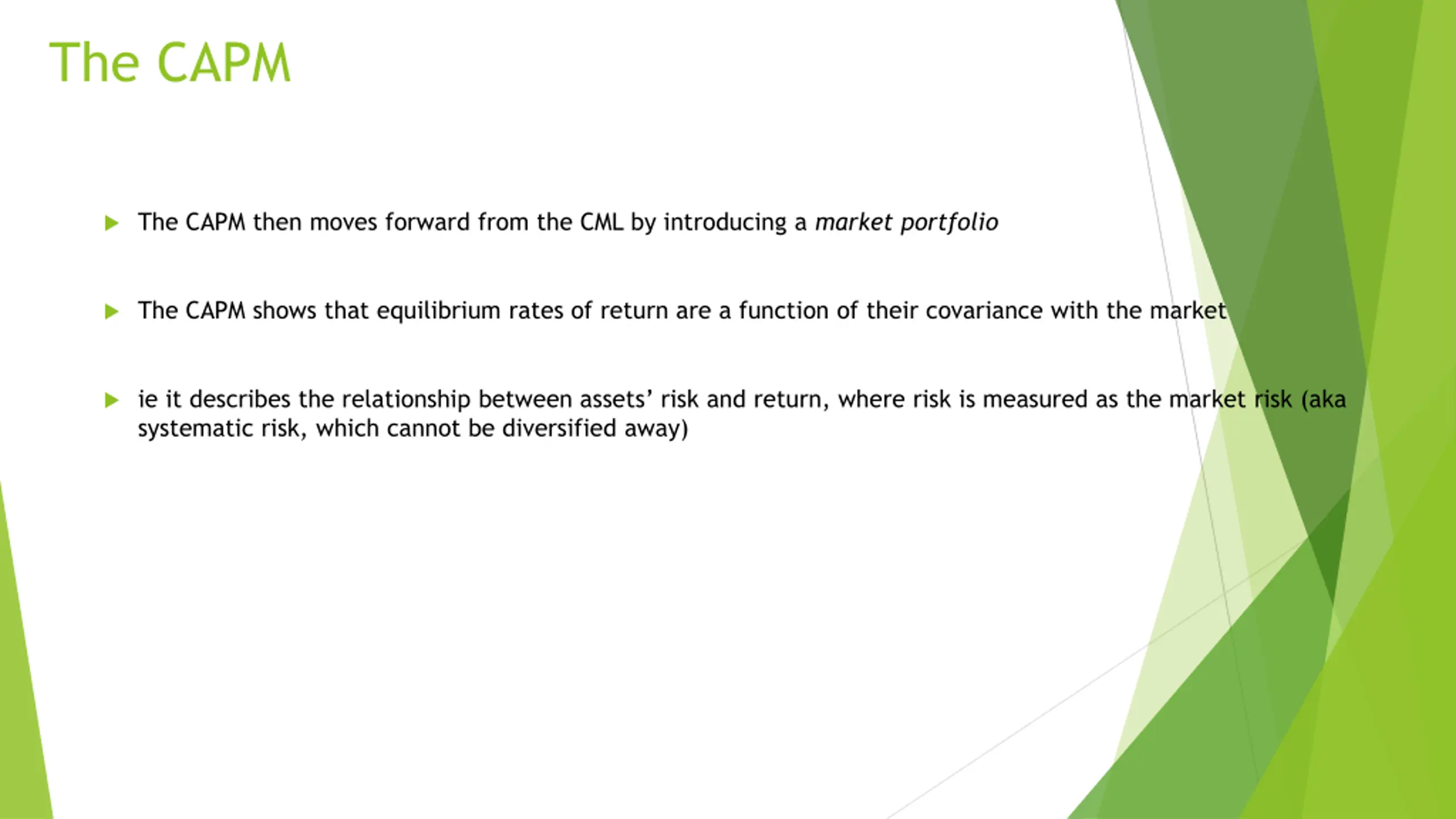 The CAPM The CAPM then moves forward from the CML by introducing a market portfolio The CAPM shows that equilibrium rates of return are a function of their covariance with the market ie it describes the relationship between assets risk and return, where risk is measured as the market risk (aka systematic risk, which cannot be diversified away)