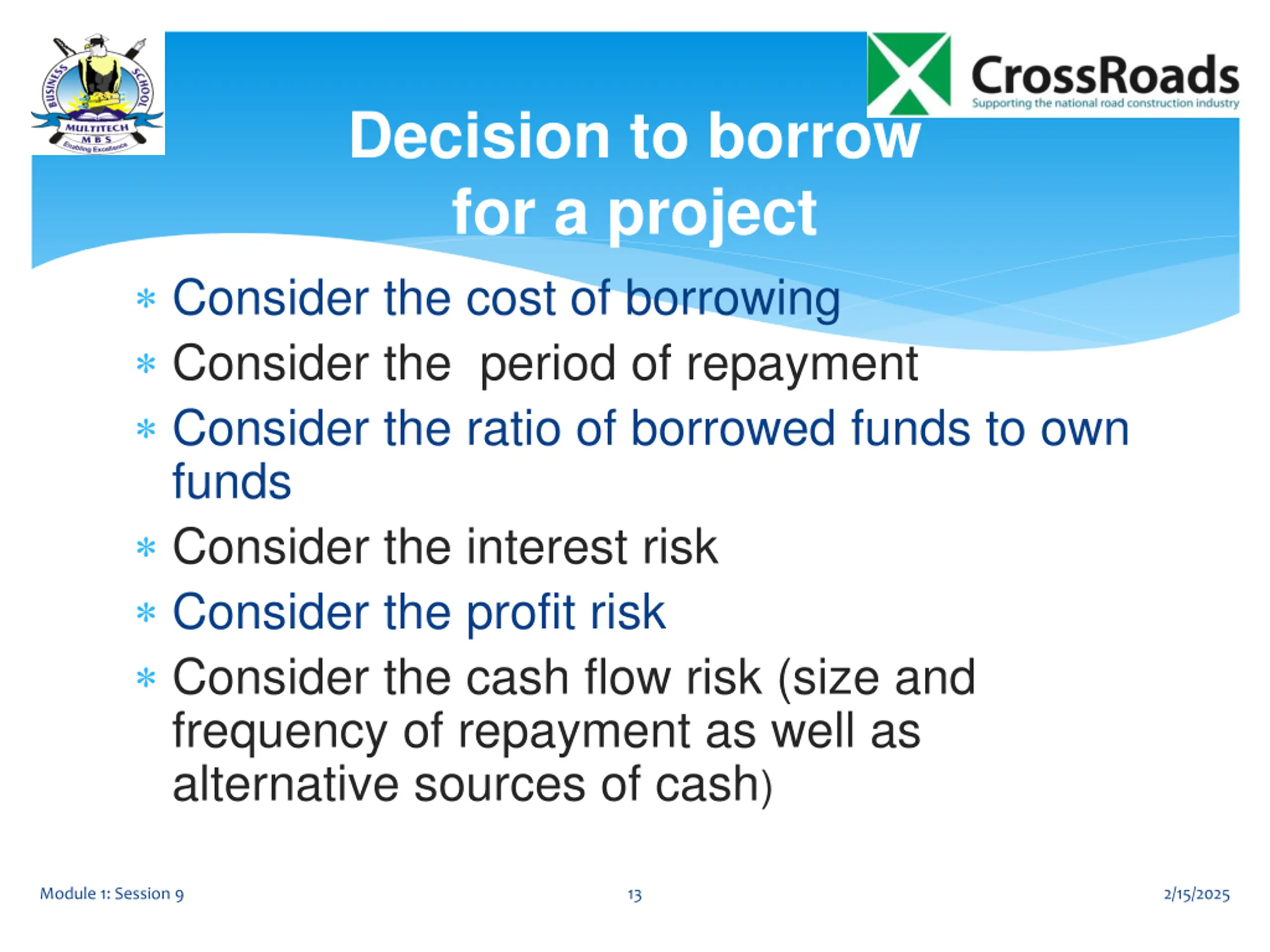Decision to borrow for a project Consider the cost of borrowing Consider the period of repayment Consider the ratio of borrowed funds to own funds Consider the interest risk Consider the profit risk Consider the cash flow risk (size and frequency of repayment as well as alternative sources of cash) Module 1: Session 9 13 2/15/2025