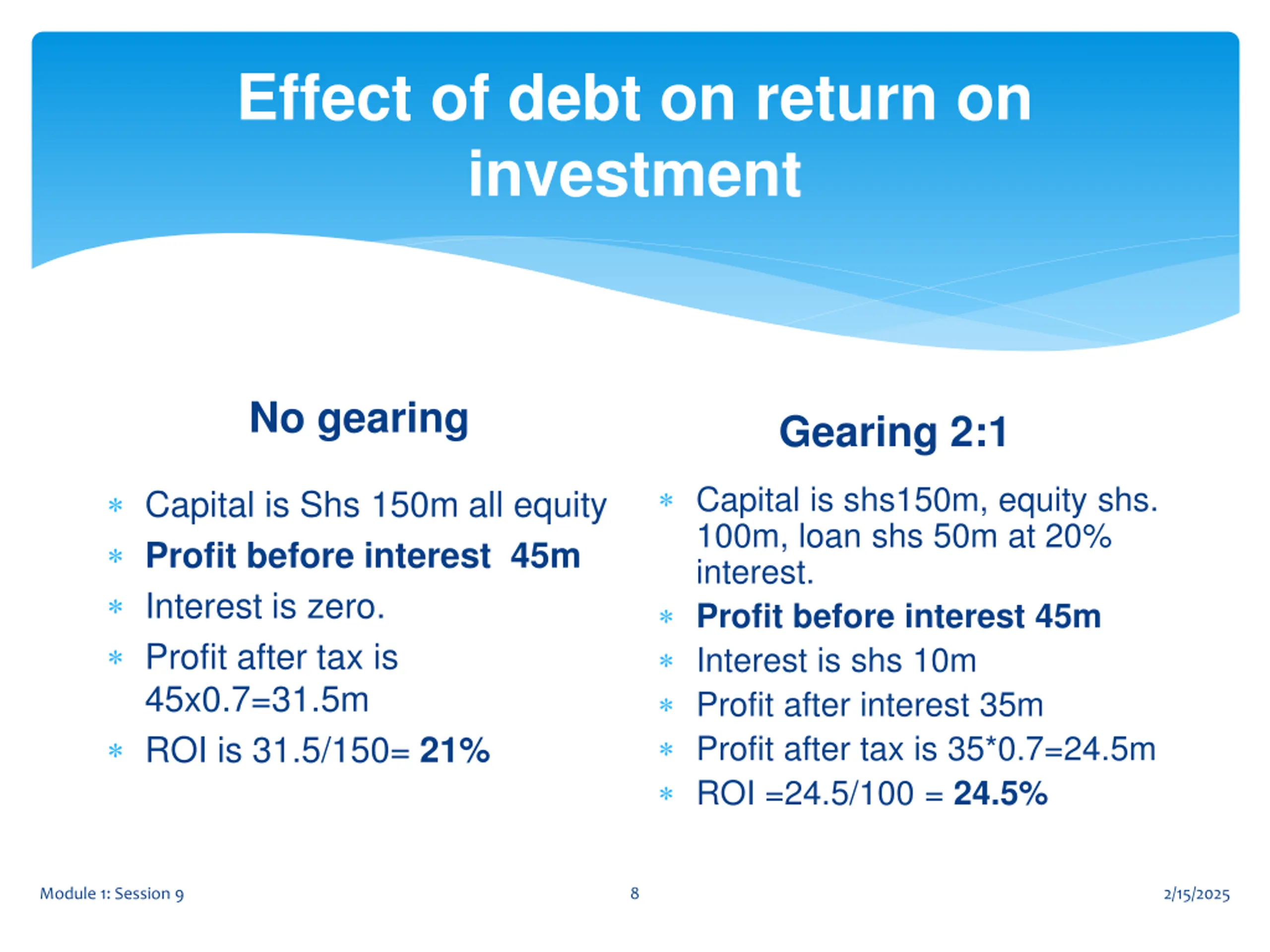Effect of debt on return on investment No gearing Gearing 2:1 Capital is shs150m, equity shs. 100m, loan shs 50m at 20% interest. Profit before interest 45m Interest is shs 10m Profit after interest 35m Profit after tax is 35*0.7=24.5m ROI =24.5/100 = 24.5% Capital is Shs 150m all equity Profit before interest 45m Interest is zero. Profit after tax is 45x0.7=31.5m ROI is 31.5/150= 21% Module 1: Session 9 8 2/15/2025