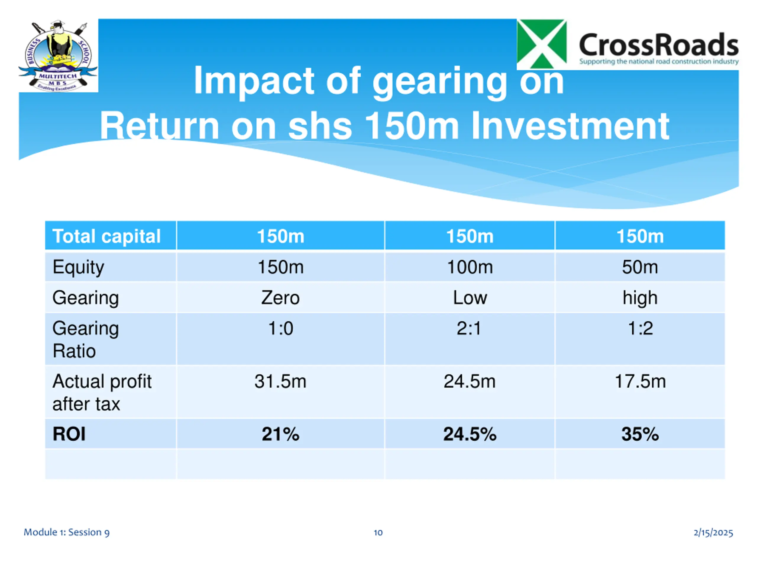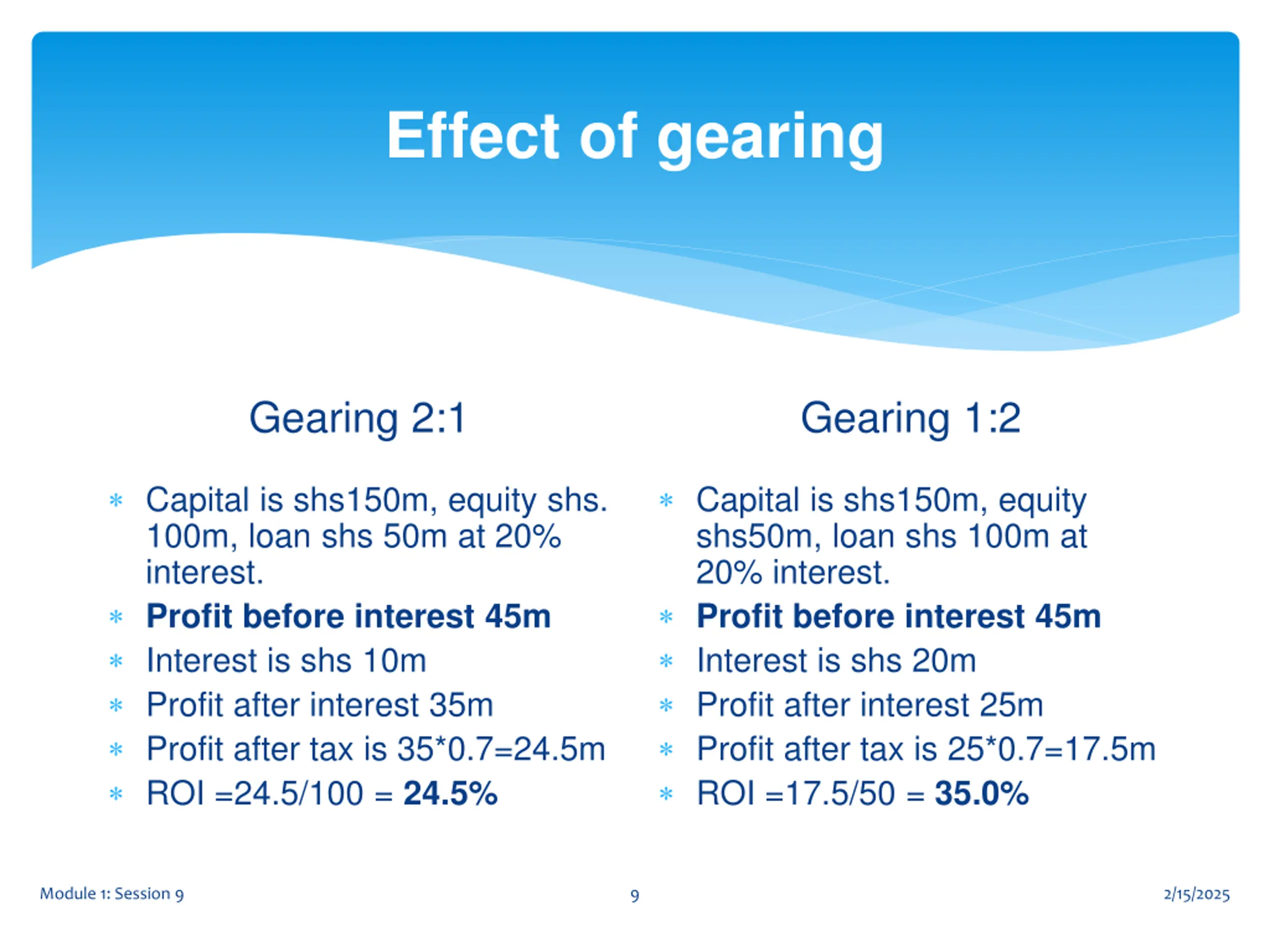 Impact of gearing on Return on shs 150m Investment Total capital Equity Gearing Gearing Ratio Actual profit after tax ROI 150m 150m Zero 1:0 150m 100m Low 2:1 150m 50m high 1:2 31.5m 24.5m 17.5m 21% 24.5% 35% Module 1: Session 9 10 2/15/2025