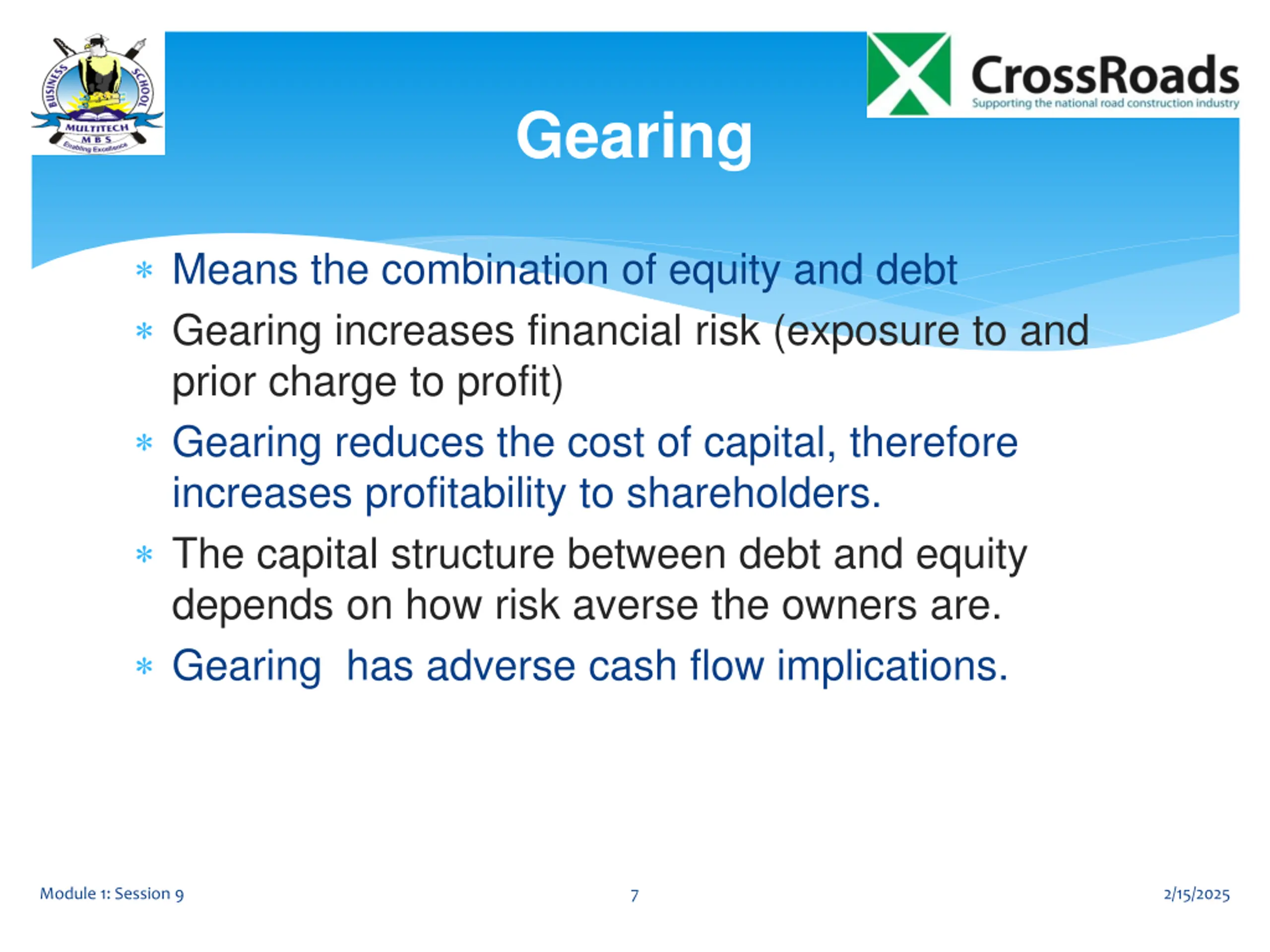 Gearing Means the combination of equity and debt Gearing increases financial risk (exposure to and prior charge to profit) Gearing reduces the cost of capital, therefore increases profitability to shareholders. The capital structure between debt and equity depends on how risk averse the owners are. Gearing has adverse cash flow implications. Module 1: Session 9 7 2/15/2025