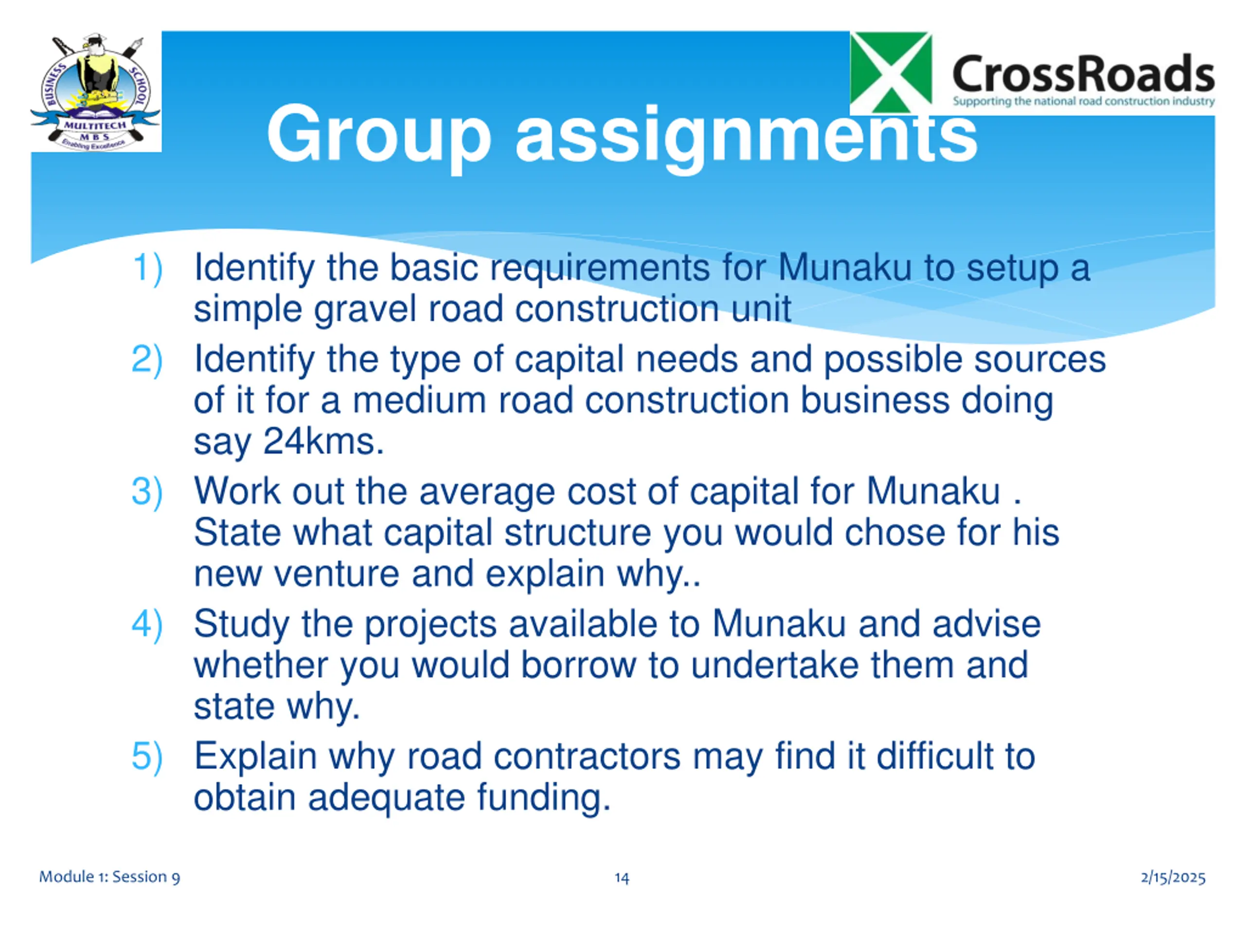 Group assignments 1) Identify the basic requirements for Munaku to setup a simple gravel road construction unit 2) Identify the type of capital needs and possible sources of it for a medium road construction business doing say 24kms. 3) Work out the average cost of capital for Munaku . State what capital structure you would chose for his new venture and explain why.. 4) Study the projects available to Munaku and advise whether you would borrow to undertake them and state why. 5) Explain why road contractors may find it difficult to obtain adequate funding. Module 1: Session 9 14 2/15/2025