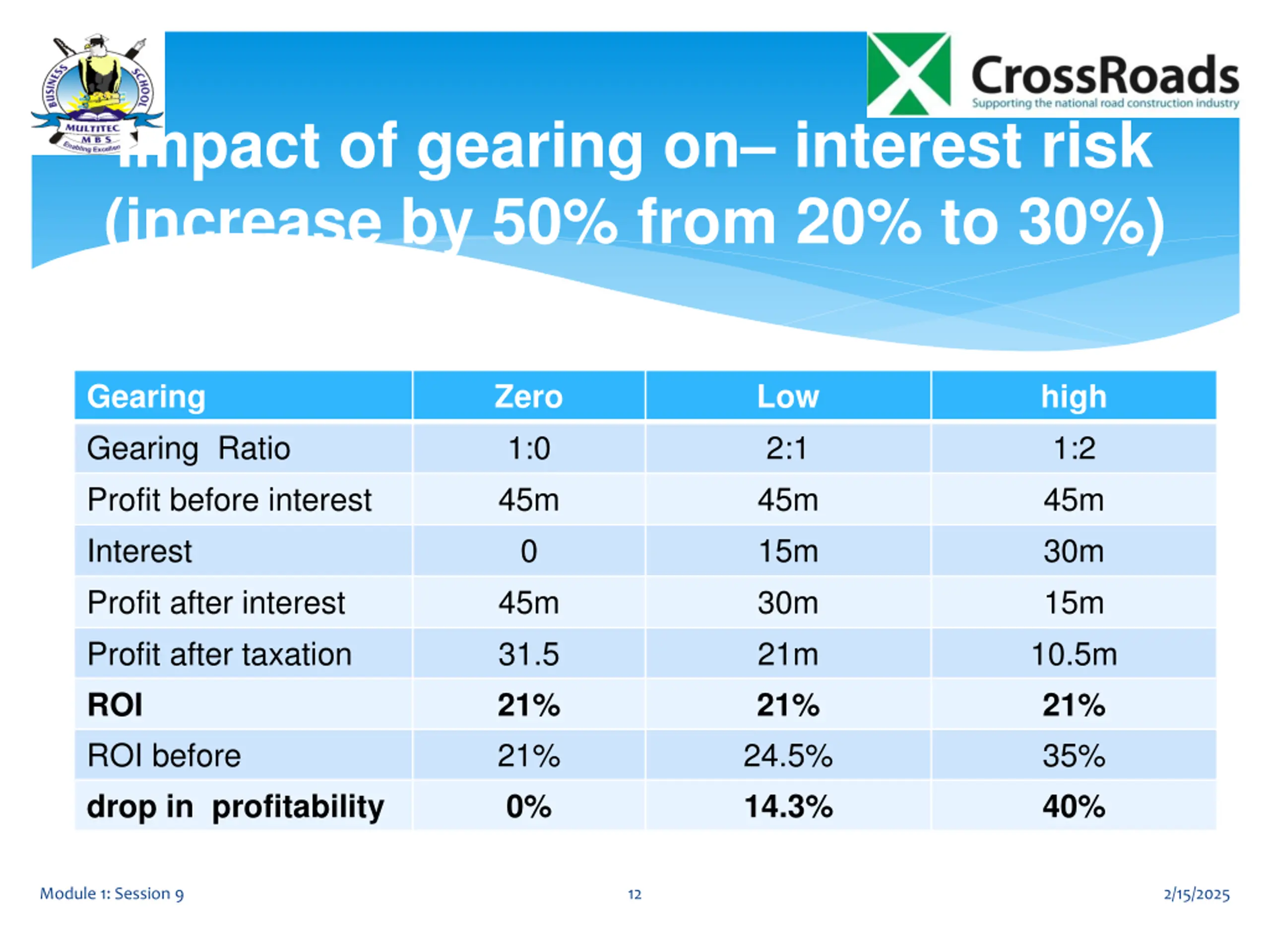 Impact of gearing on profit risk (drop by 44.4% from sh.45m to shs. 25m) Gearing Zero Low high Gearing Ratio 1:0 2:1 1:2 Profit before interest 25m 25m 25m Interest 0 10m 20m Profit after interest 25m 15m 5m Profit after taxation 17.5 10.5m 3.5m ROI 11.6% 10.5% 7% ROI before 21% 24.5% 35% drop in profitability 44.4% 57% 80% Module 1: Session 9 11 2/15/2025