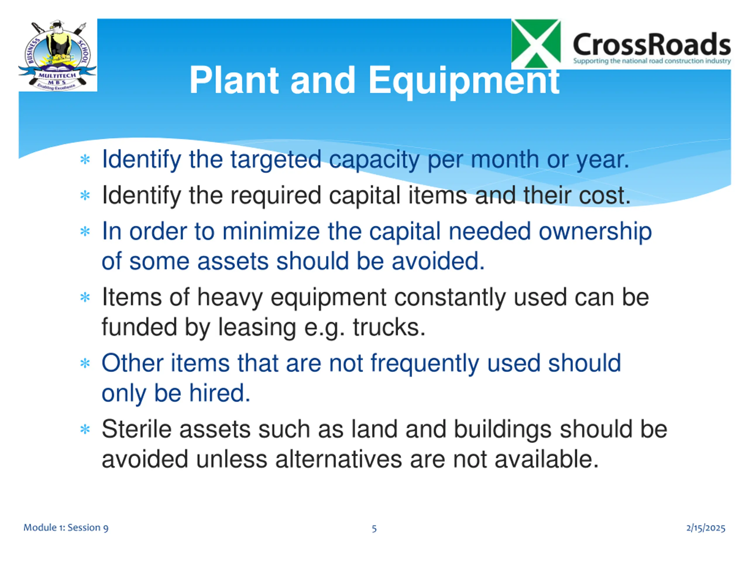 Plant and Equipment Identify the targeted capacity per month or year. Identify the required capital items and their cost. In order to minimize the capital needed ownership of some assets should be avoided. Items of heavy equipment constantly used can be funded by leasing e.g. trucks. Other items that are not frequently used should only be hired. Sterile assets such as land and buildings should be avoided unless alternatives are not available. Module 1: Session 9 5 2/15/2025