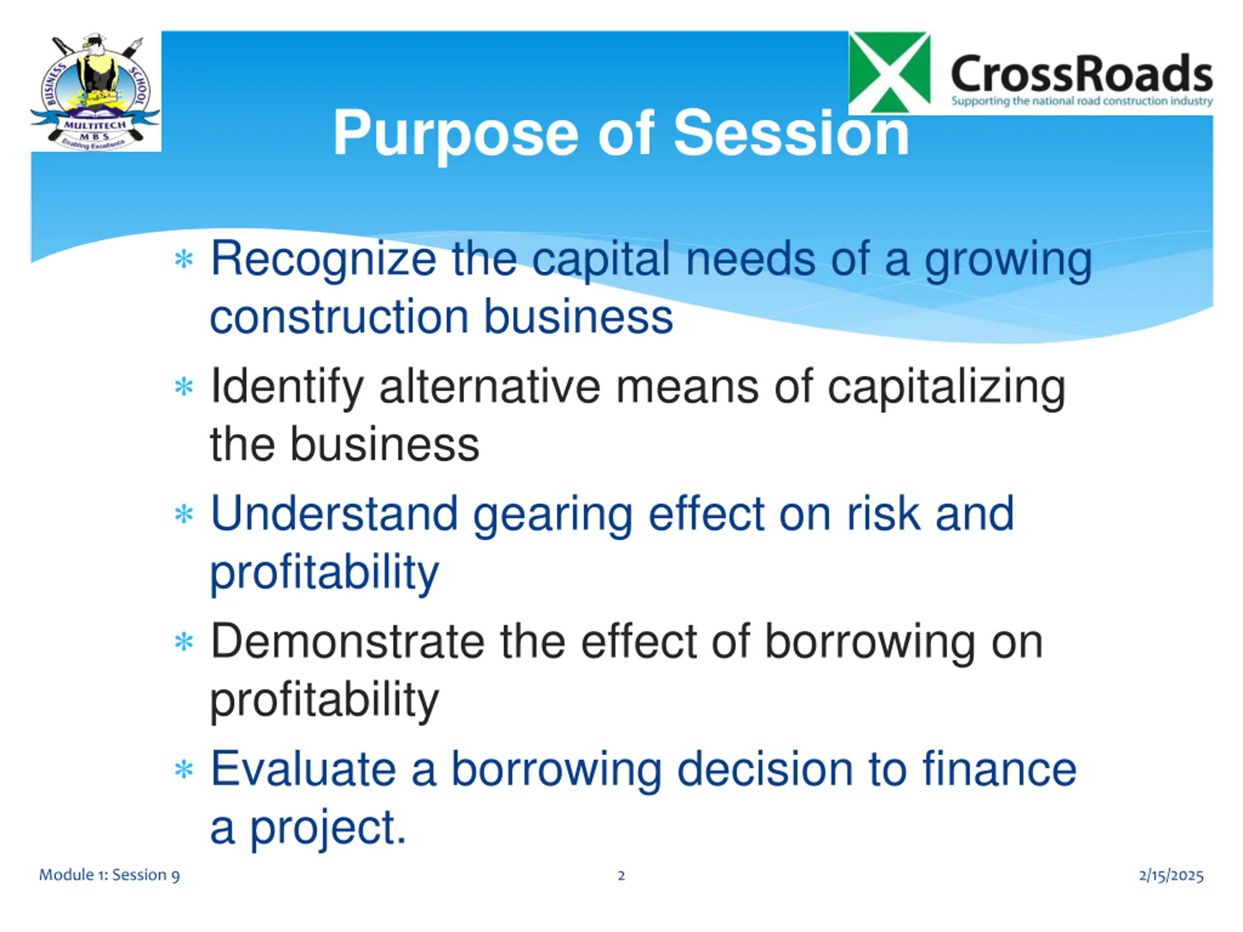 Purpose of Session Recognize the capital needs of a growing construction business Identify alternative means of capitalizing the business Understand gearing effect on risk and profitability Demonstrate the effect of borrowing on profitability Evaluate a borrowing decision to finance a project. Module 1: Session 9 2 2/15/2025