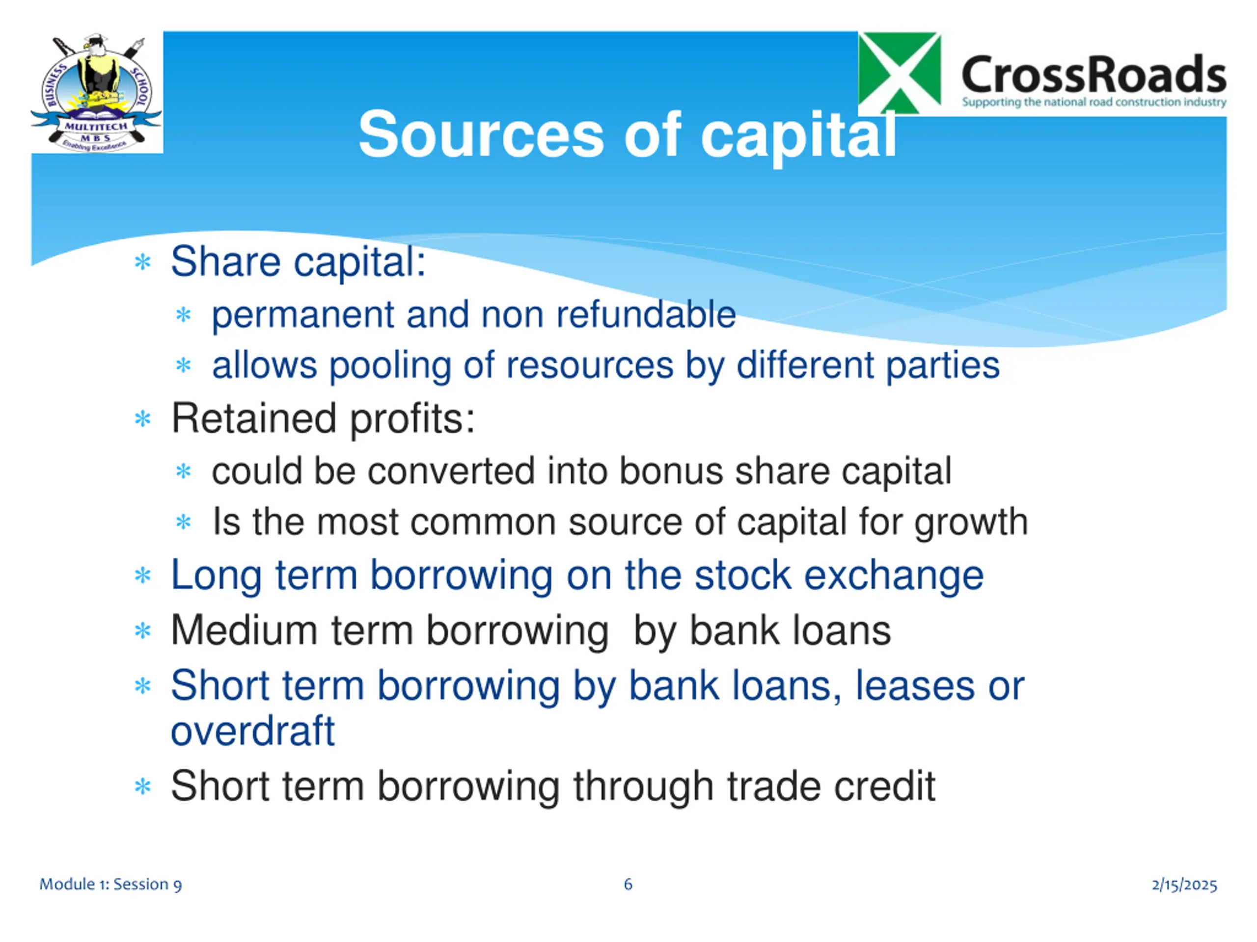 Sources of capital Share capital: permanent and non refundable allows pooling of resources by different parties Retained profits: could be converted into bonus share capital Is the most common source of capital for growth Long term borrowing on the stock exchange Medium term borrowing by bank loans Short term borrowing by bank loans, leases or overdraft Short term borrowing through trade credit Module 1: Session 9 6 2/15/2025