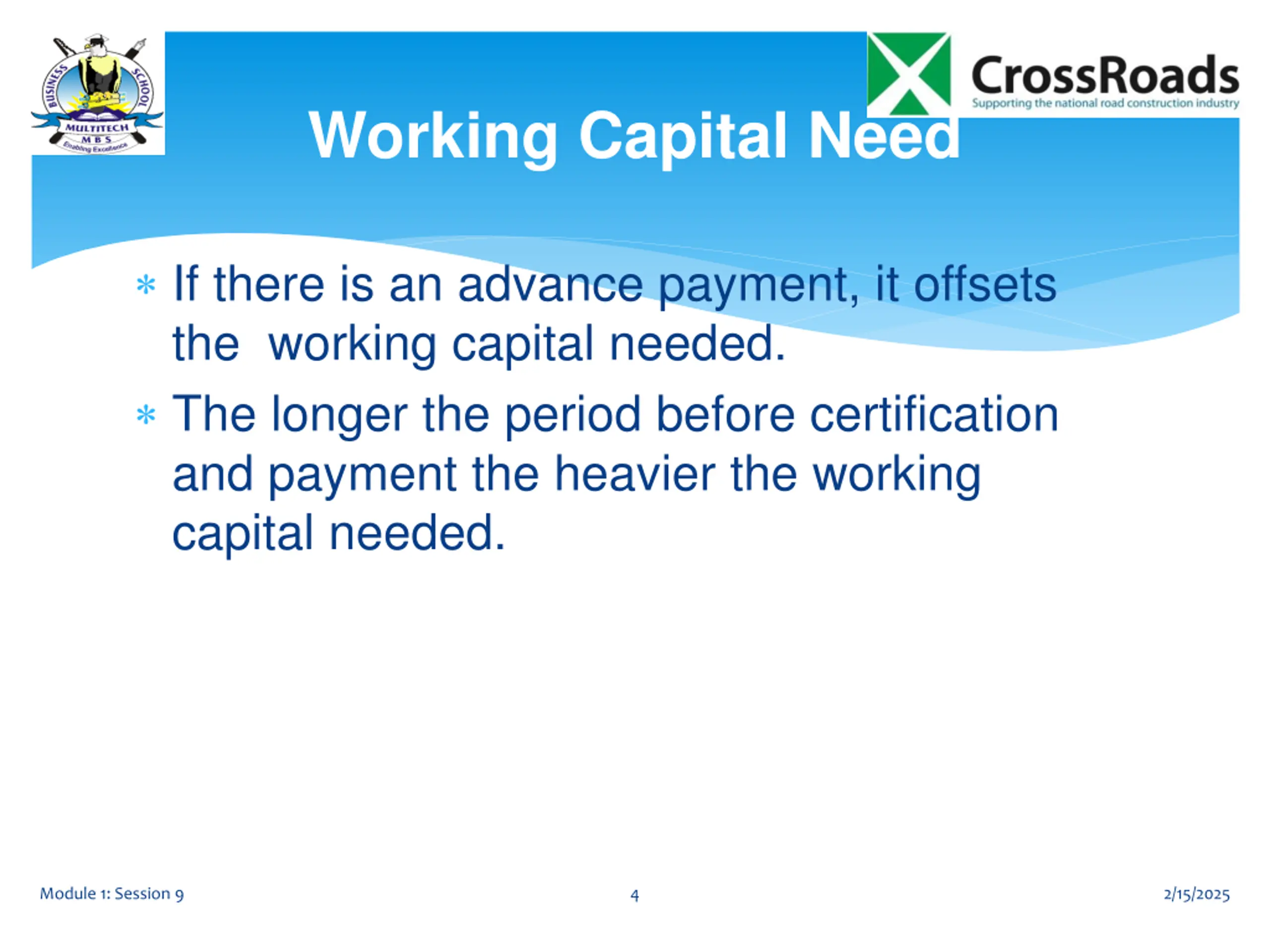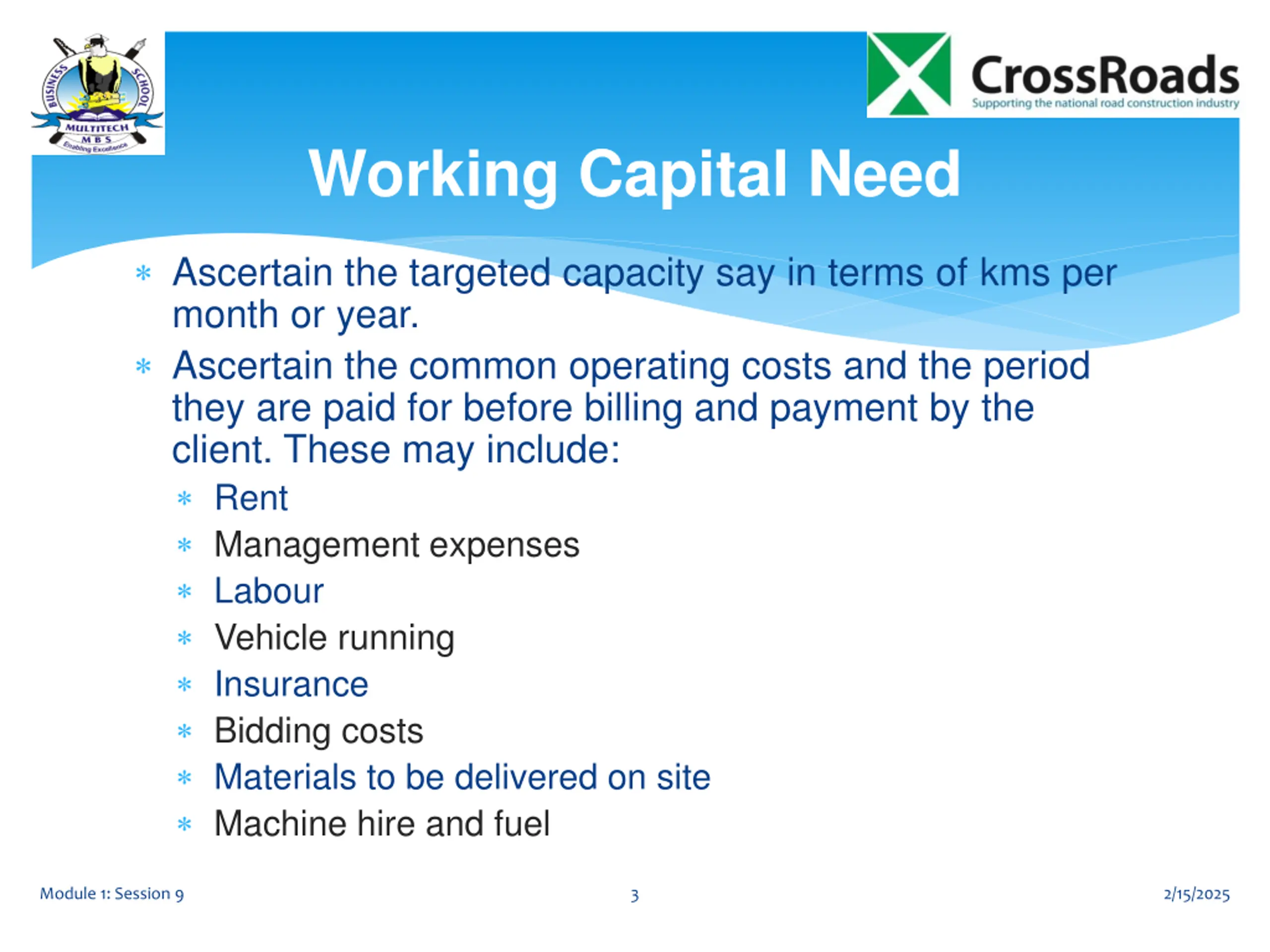 Working Capital Need Ascertain the targeted capacity say in terms of kms per month or year. Ascertain the common operating costs and the period they are paid for before billing and payment by the client. These may include: Rent Management expenses Labour Vehicle running Insurance Bidding costs Materials to be delivered on site Machine hire and fuel Module 1: Session 9 3 2/15/2025