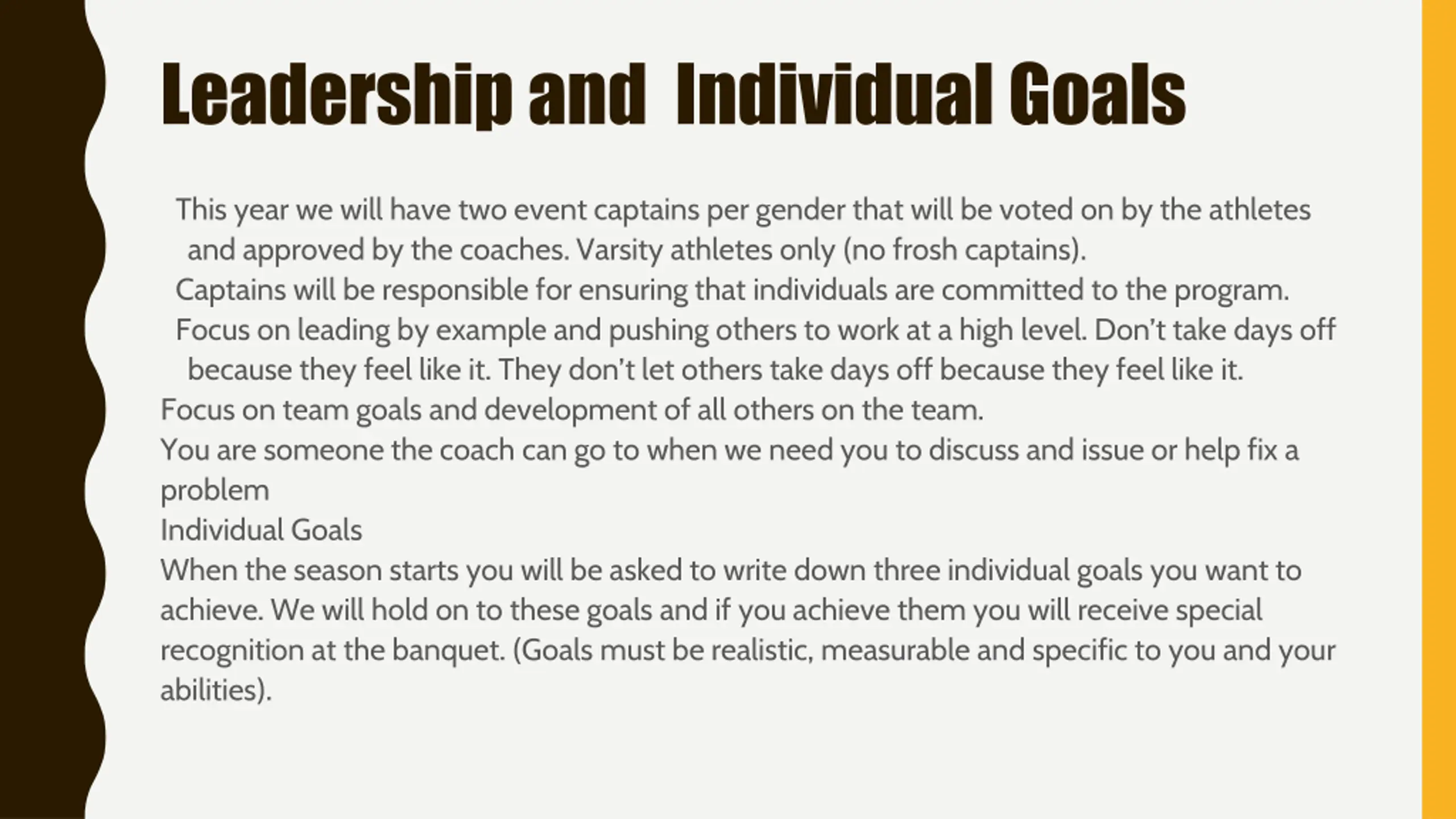 Leadership and Individual Goals This year we will have two event captains per gender that will be voted on by the athletes and approved by the coaches. Varsity athletes only (no frosh captains). Captains will be responsible for ensuring that individuals are committed to the program. Focus on leading by example and pushing others to work at a high level. Don t take days off because they feel like it. They don t let others take days off because they feel like it. Focus on team goals and development of all others on the team. You are someone the coach can go to when we need you to discuss and issue or help fix a problem Individual Goals When the season starts you will be asked to write down three individual goals you want to achieve. We will hold on to these goals and if you achieve them you will receive special recognition at the banquet. (Goals must be realistic, measurable and specific to you and your abilities).