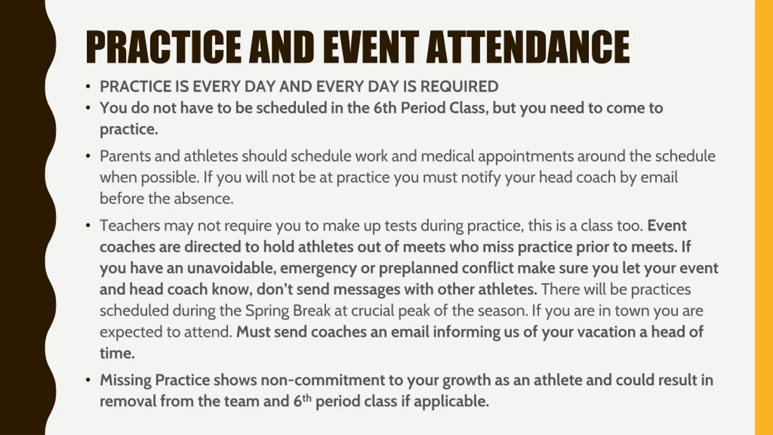 PRACTICE AND EVENT ATTENDANCE PRACTICE IS EVERY DAY AND EVERY DAY IS REQUIRED You do not have to be scheduled in the 6th Period Class, but you need to come to practice. Parents and athletes should schedule work and medical appointments around the schedule when possible. If you will not be at practice you must notify your head coach by email before the absence. Teachers may not require you to make up tests during practice, this is a class too. Event coaches are directed to hold athletes out of meets who miss practice prior to meets. If you have an unavoidable, emergency or preplanned conflict make sure you let your event and head coach know, don t send messages with other athletes. There will be practices scheduled during the Spring Break at crucial peak of the season. If you are in town you are expected to attend. Must send coaches an email informing us of your vacation a head of time. Missing Practice shows non-commitment to your growth as an athlete and could result in removal from the team and 6thperiod class if applicable.