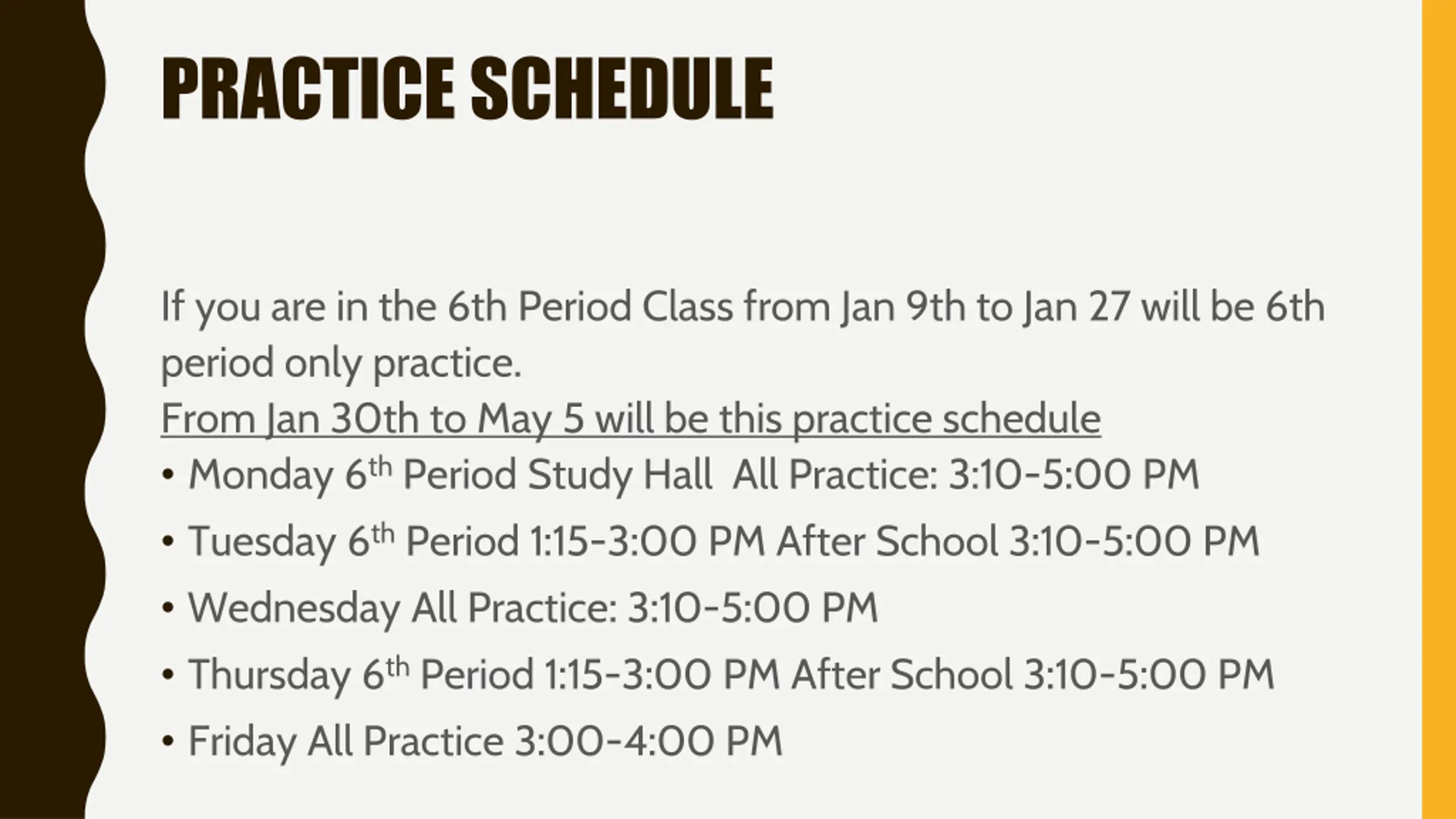 PRACTICE SCHEDULE If you are in the 6th Period Class from Jan 9th to Jan 27 will be 6th period only practice. From Jan 30th to May 5 will be this practice schedule Monday 6thPeriod Study Hall All Practice: 3:10-5:00 PM Tuesday 6thPeriod 1:15-3:00 PM After School 3:10-5:00 PM Wednesday All Practice: 3:10-5:00 PM Thursday 6thPeriod 1:15-3:00 PM After School 3:10-5:00 PM Friday All Practice 3:00-4:00 PM