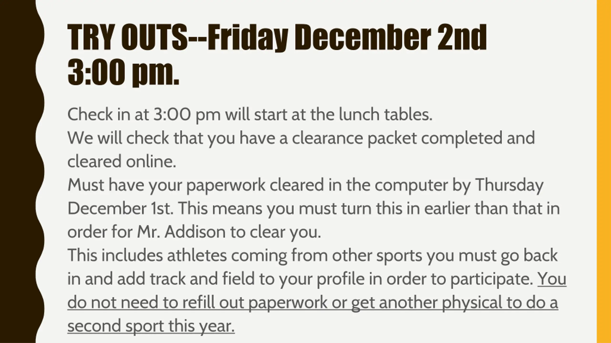 TRY OUTS--Friday December 2nd 3:00 pm. Check in at 3:00 pm will start at the lunch tables. We will check that you have a clearance packet completed and cleared online. Must have your paperwork cleared in the computer by Thursday December 1st. This means you must turn this in earlier than that in order for Mr. Addison to clear you. This includes athletes coming from other sports you must go back in and add track and field to your profile in order to participate. You do not need to refill out paperwork or get another physical to do a second sport this year.