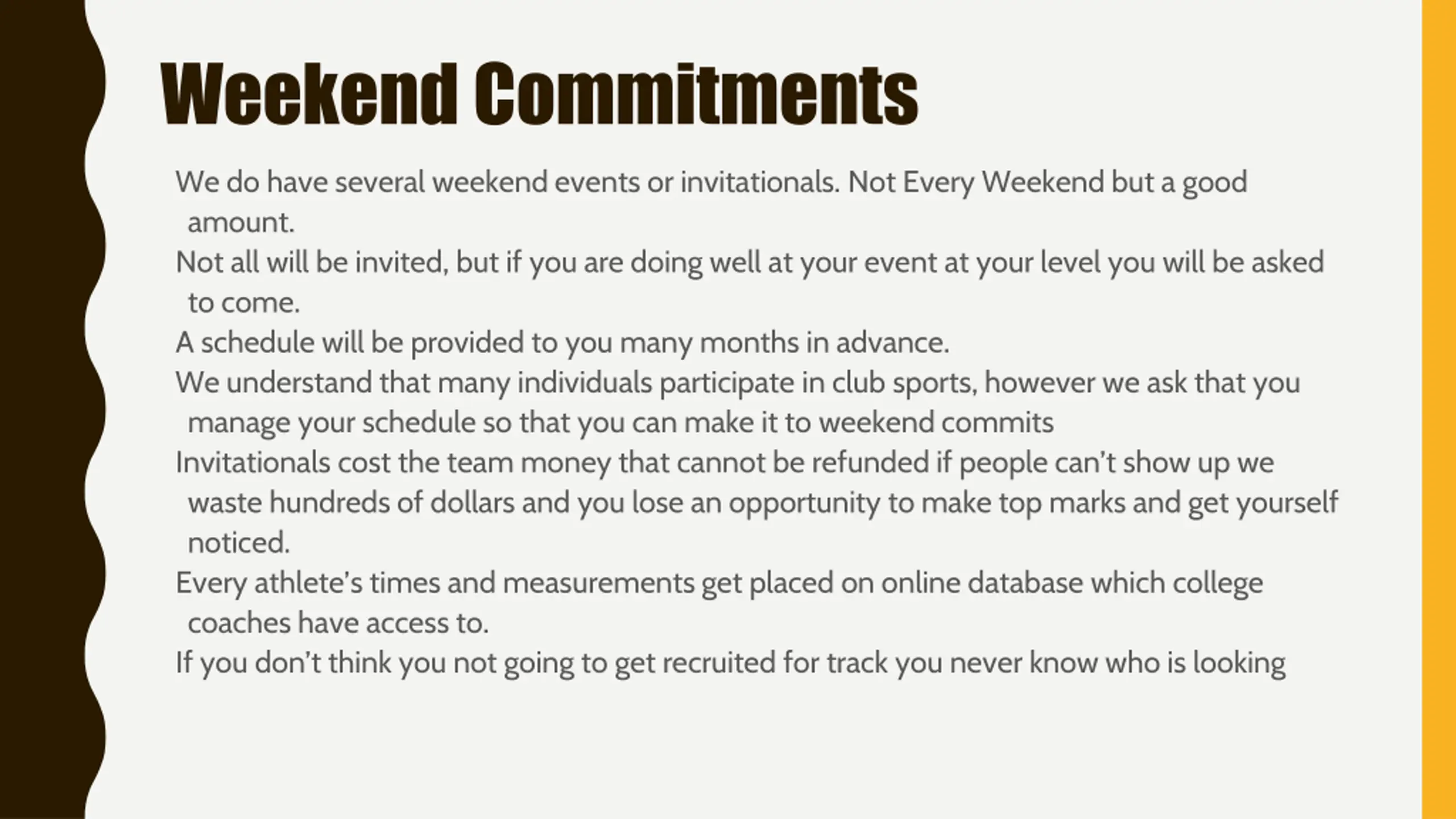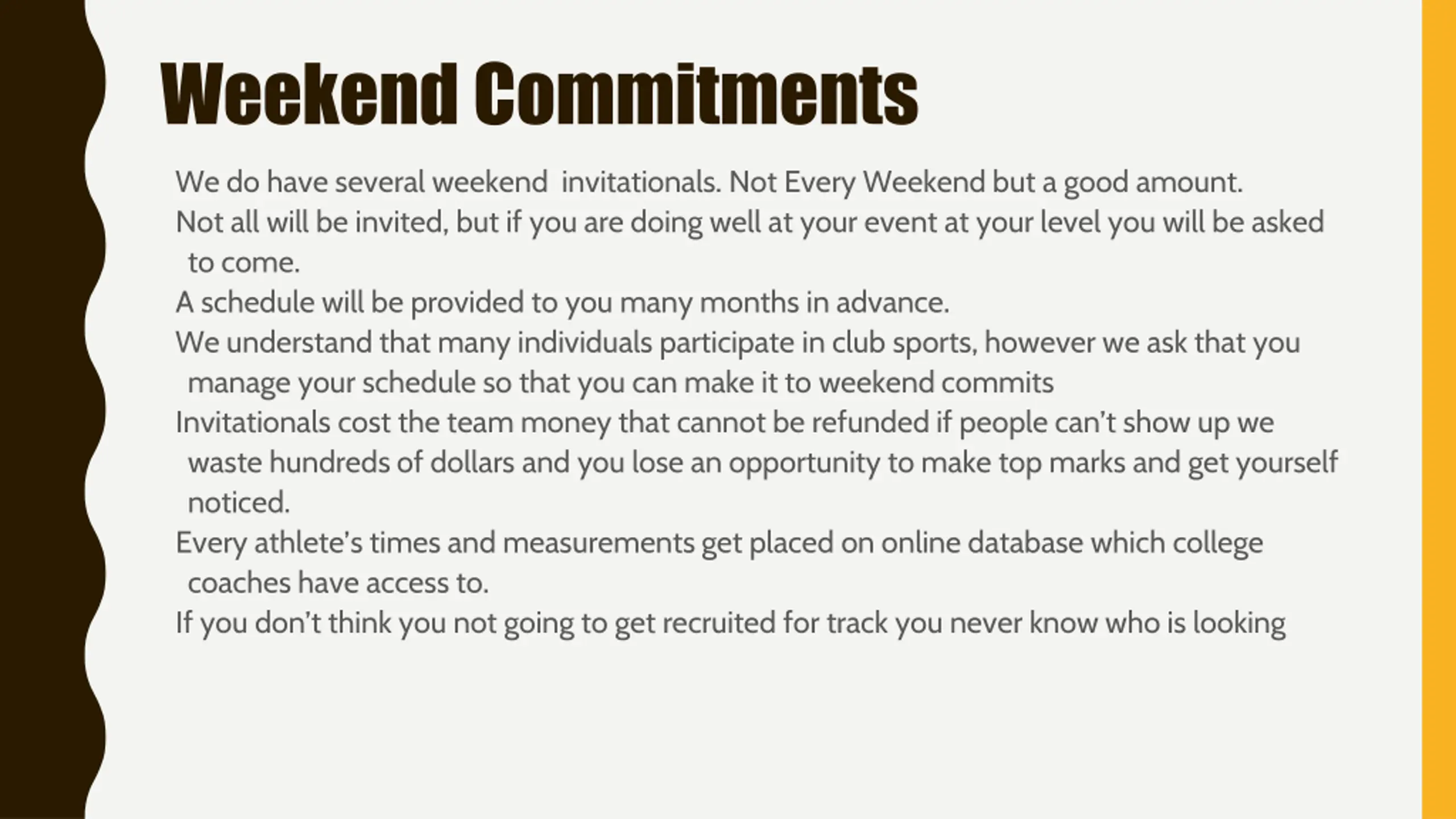 Weekend Commitments We do have several weekend invitationals. Not Every Weekend but a good amount. Not all will be invited, but if you are doing well at your event at your level you will be asked to come. A schedule will be provided to you many months in advance. We understand that many individuals participate in club sports, however we ask that you manage your schedule so that you can make it to weekend commits Invitationals cost the team money that cannot be refunded if people can t show up we waste hundreds of dollars and you lose an opportunity to make top marks and get yourself noticed. Every athlete s times and measurements get placed on online database which college coaches have access to. If you don t think you not going to get recruited for track you never know who is looking