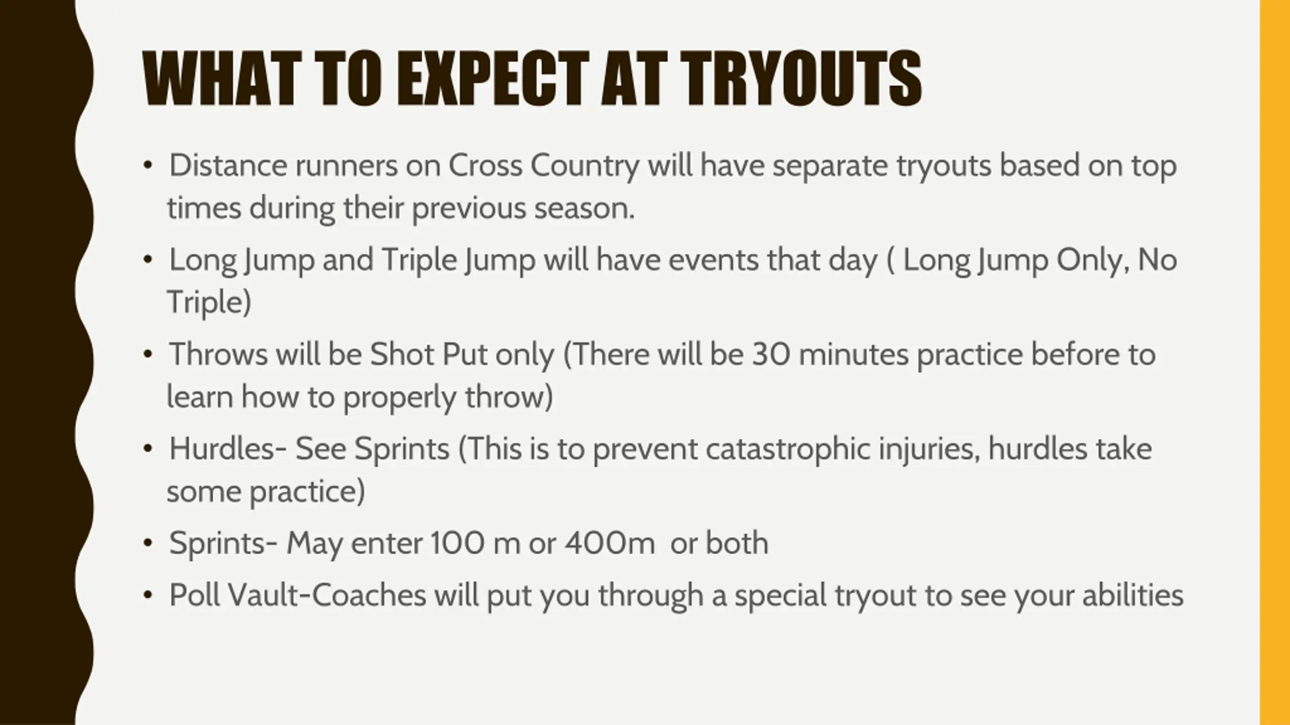 WHAT TO EXPECT AT TRYOUTS Distance runners on Cross Country will have separate tryouts based on top times during their previous season. Long Jump and Triple Jump will have events that day ( Long Jump Only, No Triple) Throws will be Shot Put only (There will be 30 minutes practice before to learn how to properly throw) Hurdles- See Sprints (This is to prevent catastrophic injuries, hurdles take some practice) Sprints- May enter 100 m or 400m or both Poll Vault-Coaches will put you through a special tryout to see your abilities