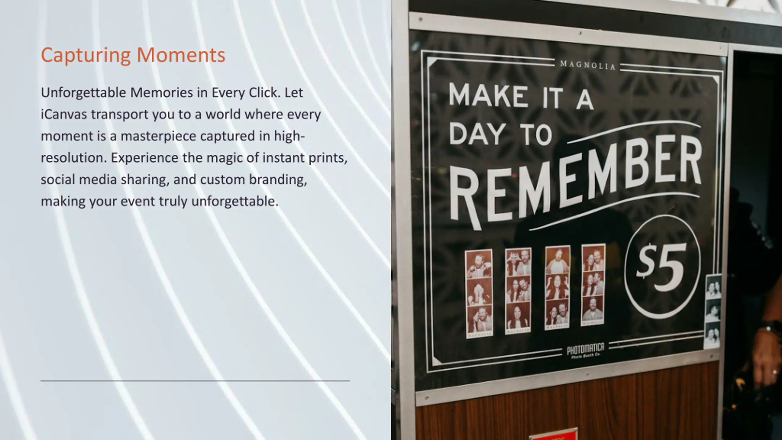 Capturing Moments Unforgettable Memories in Every Click. Let iCanvas transport you to a world where every moment is a masterpiece captured in high- resolution. Experience the magic of instant prints, social media sharing, and custom branding, making your event truly unforgettable.